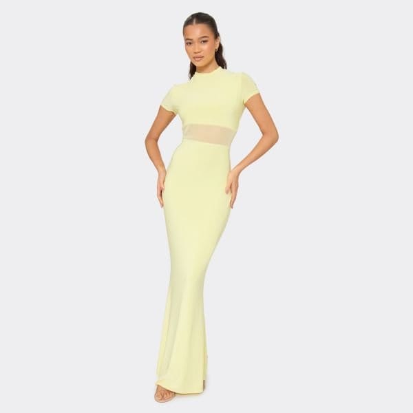 Designed with a vibrant yellow, high neck, short sleeve, slinky material with sheer mesh insert detailing, this maxi dress is perfect for summer. Ideal for those looking to make a bold statement.