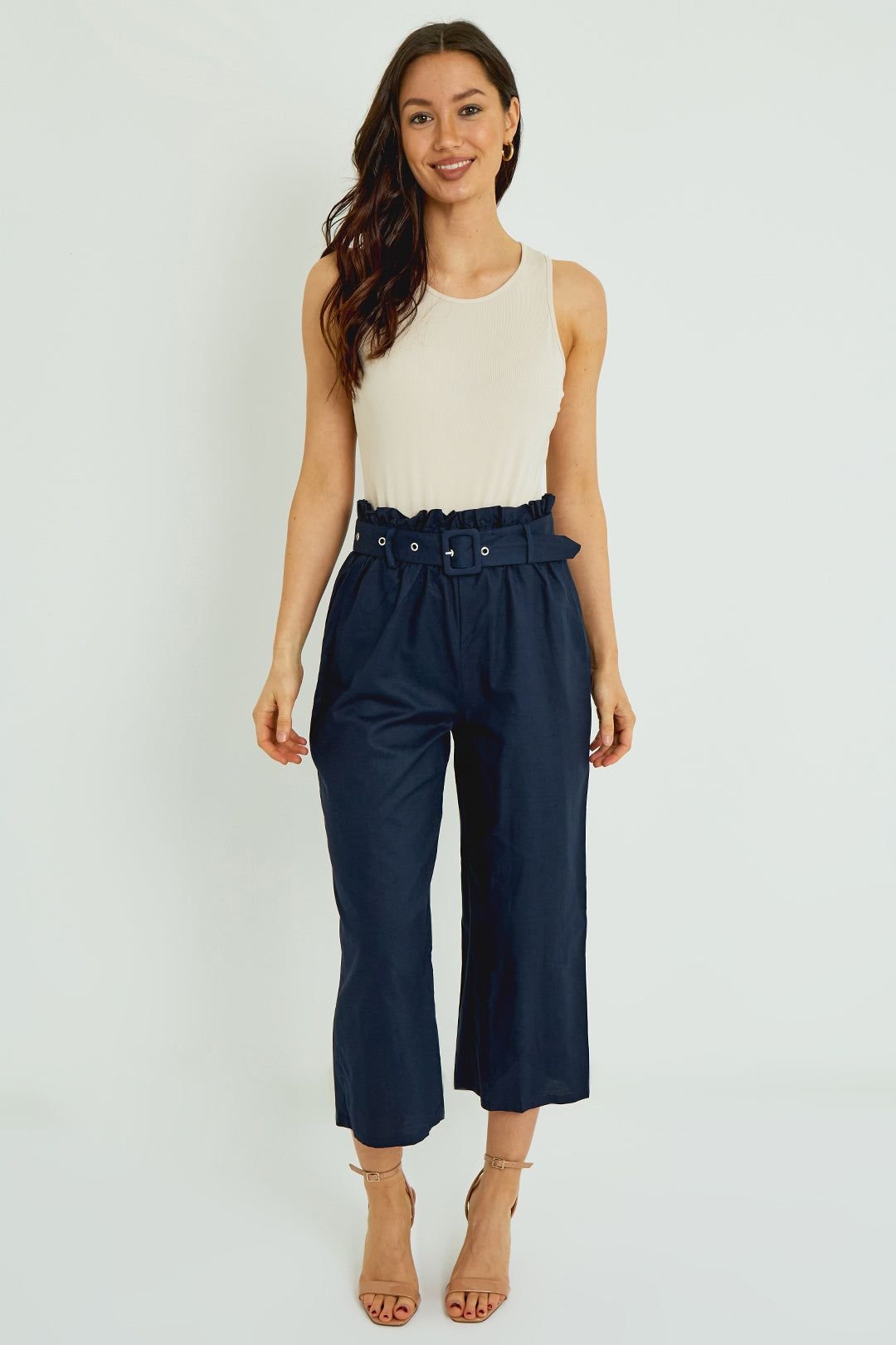 The ELAINA FASHION Navy Cotton Paper Bag Waist Trousers is ideal for casual, everyday.
