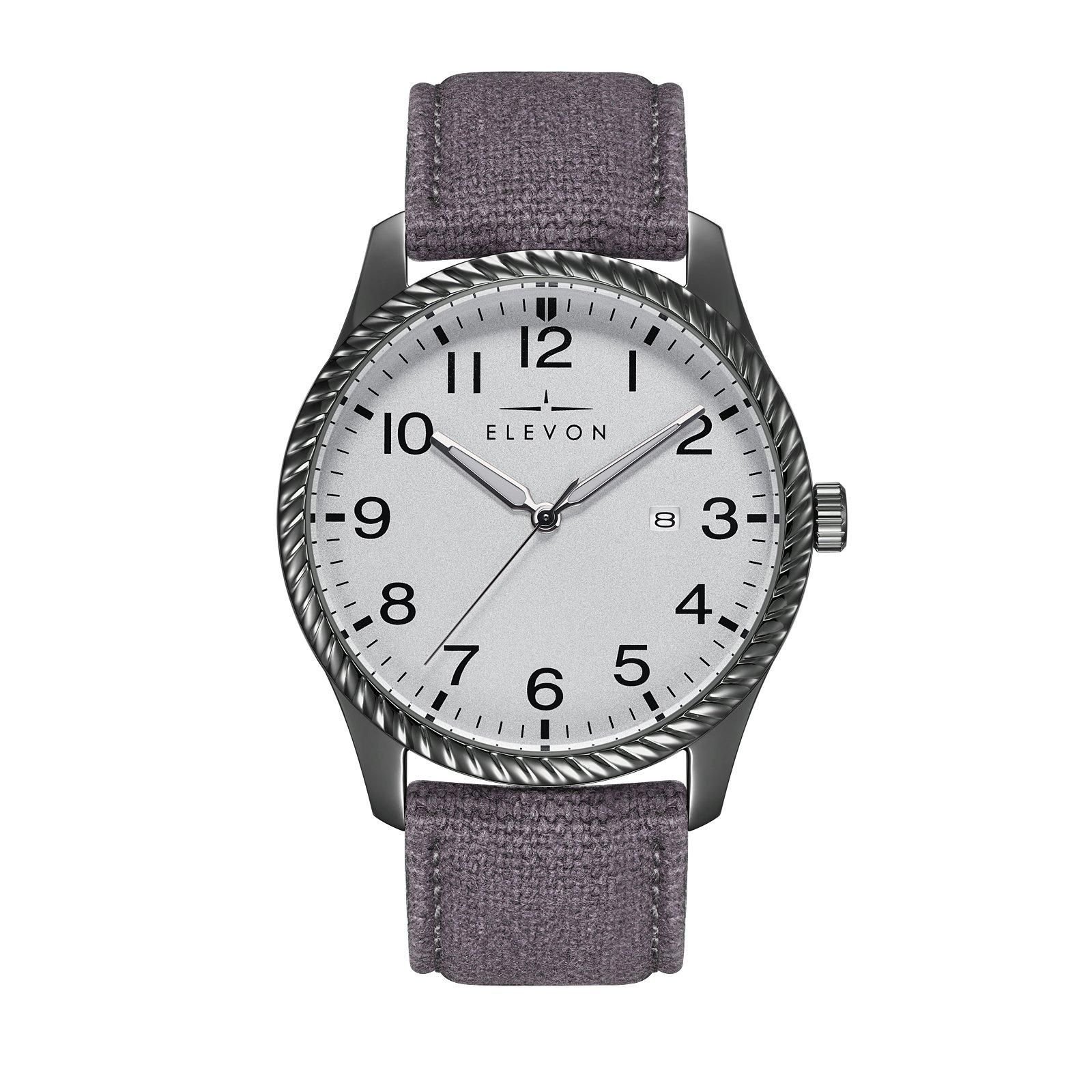 Stylish Elevon men's watch in grey with a canvas-overlaid genuine-leather strap. Features a polished alloy case, Japanese Seiko PC21 Quartz Movement, and non-glare scratch-resistant mineral crystal. Ideal for everyday wear with its date display and luminous hands.