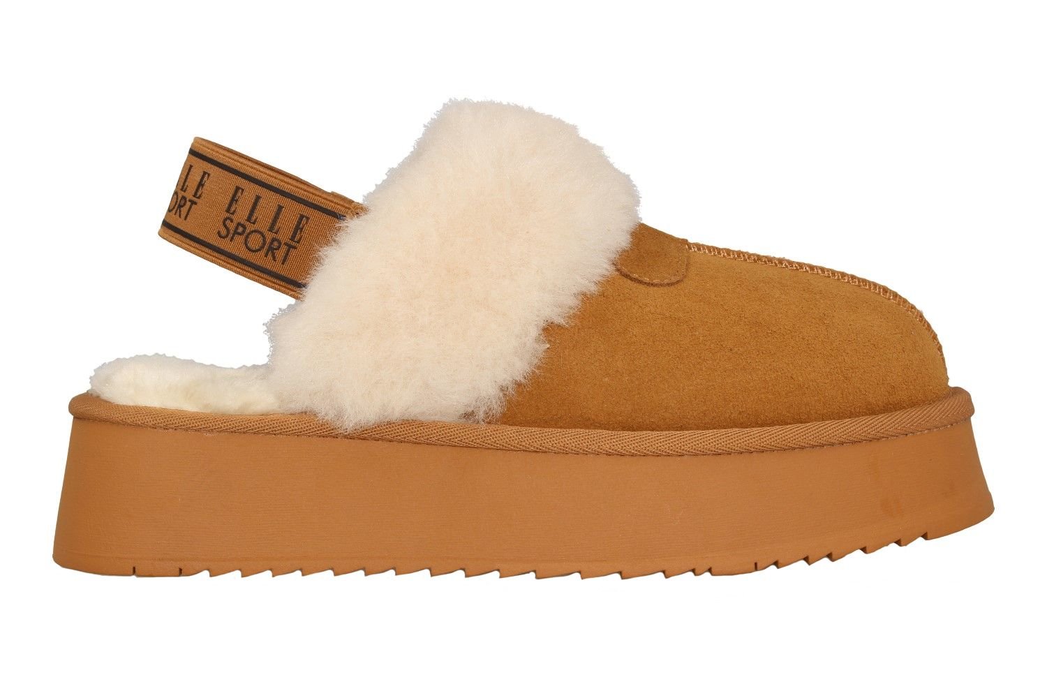 Stylish tan faux fur platform slippers by Elle Sport. Featuring a faux suede upper with a plush faux fur lining, these slip-on mules are perfect for indoor or outdoor wear. The adjustable slingback strap ensures a secure fit, while the thick platform sole adds height and durability.
