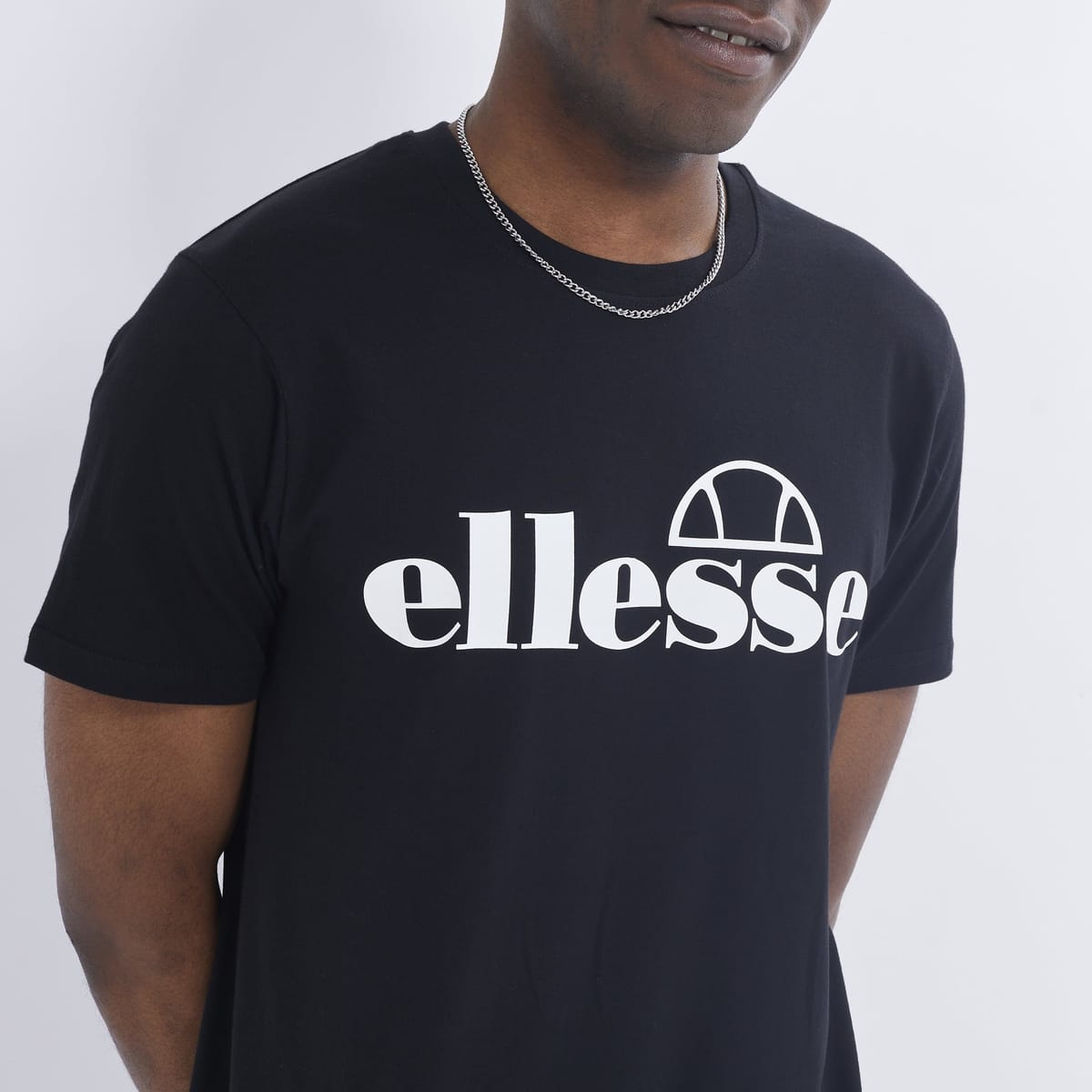 Modern Ellesse Fuenti T-Shirt in black with a crew neckline and short sleeves. Made from soft cotton for comfort, featuring a large logo print on the front. Ideal for a casual and fashion-forward look.