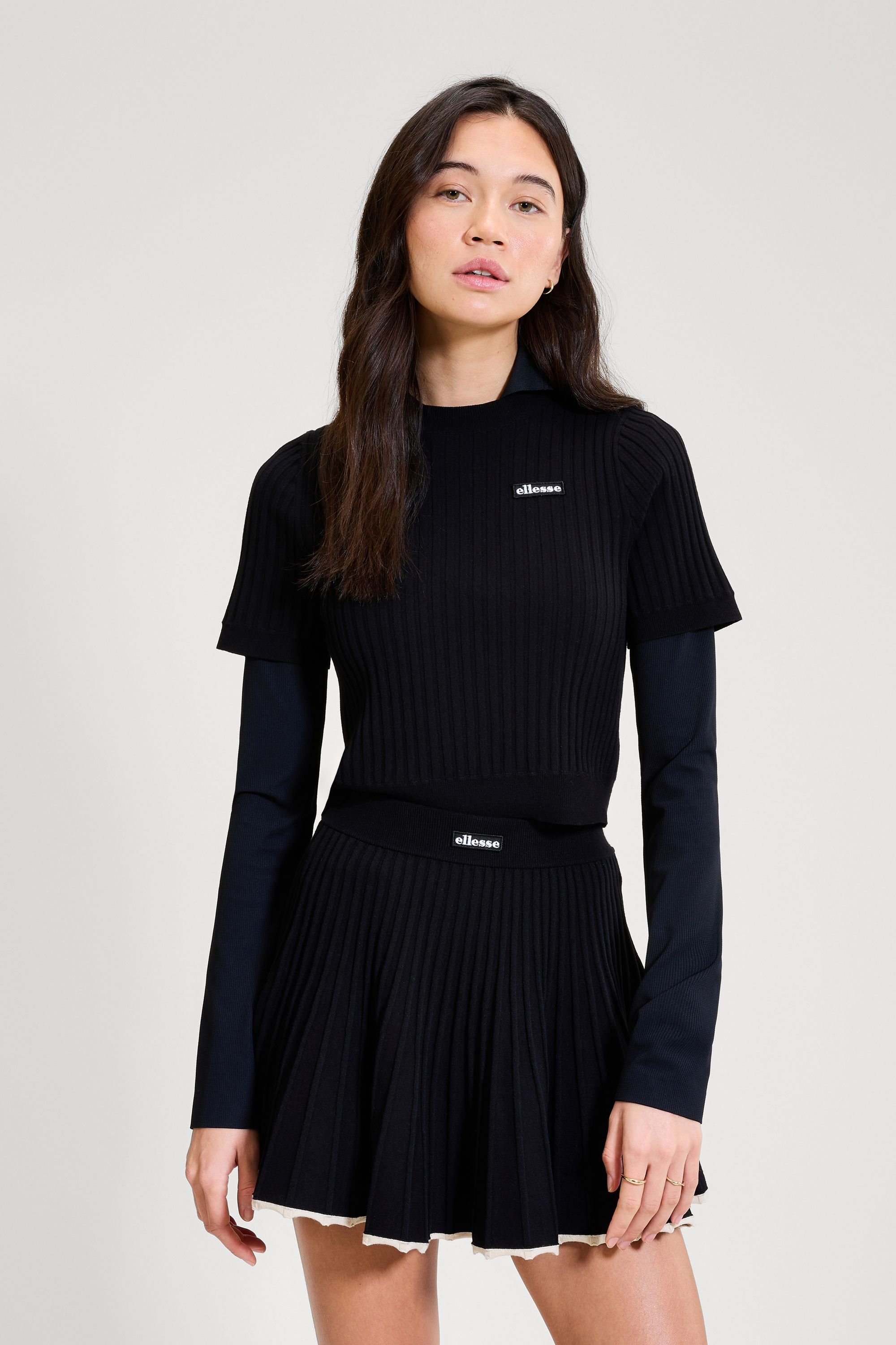 Stylish black knitted tee by Ellesse with a cropped silhouette and ribbed detailing. Designed for flexibility and movement, perfect for active wear or casual layering.