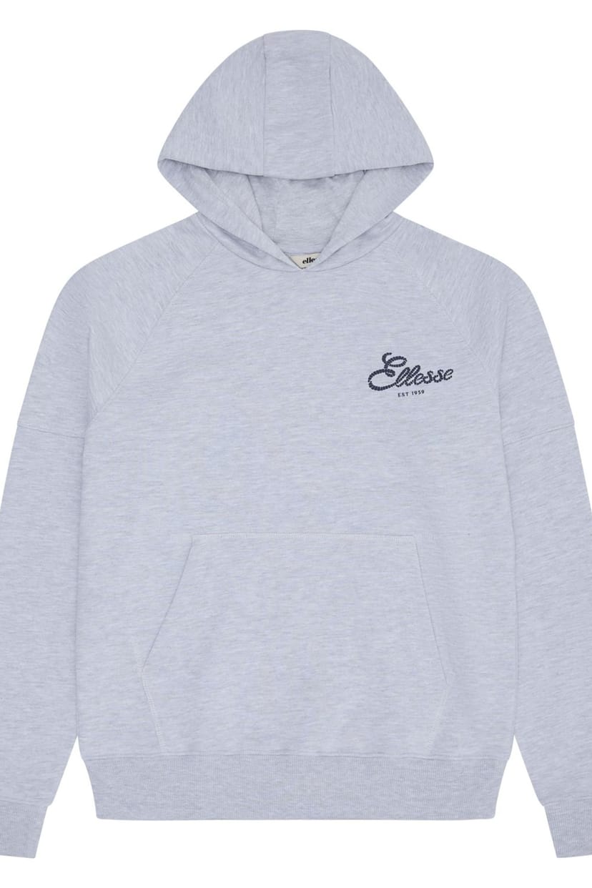 Stylish Ellesse Deliziosi Hoodie in light grey featuring PU logo prints on both sides. Made from 340GSM cotton brushback for a soft and comfortable feel. Ideal for casual wear.