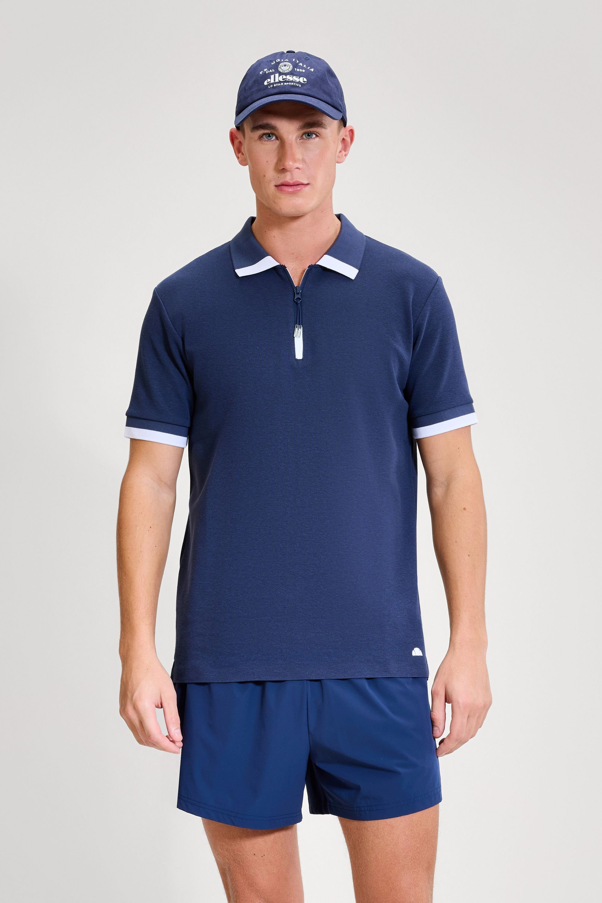 Sporty and smart Ellesse Kelvias Polo in mid navy. Features a Jacquard knit collar, printed nylon zips, and silicone branding. Built for versatility.