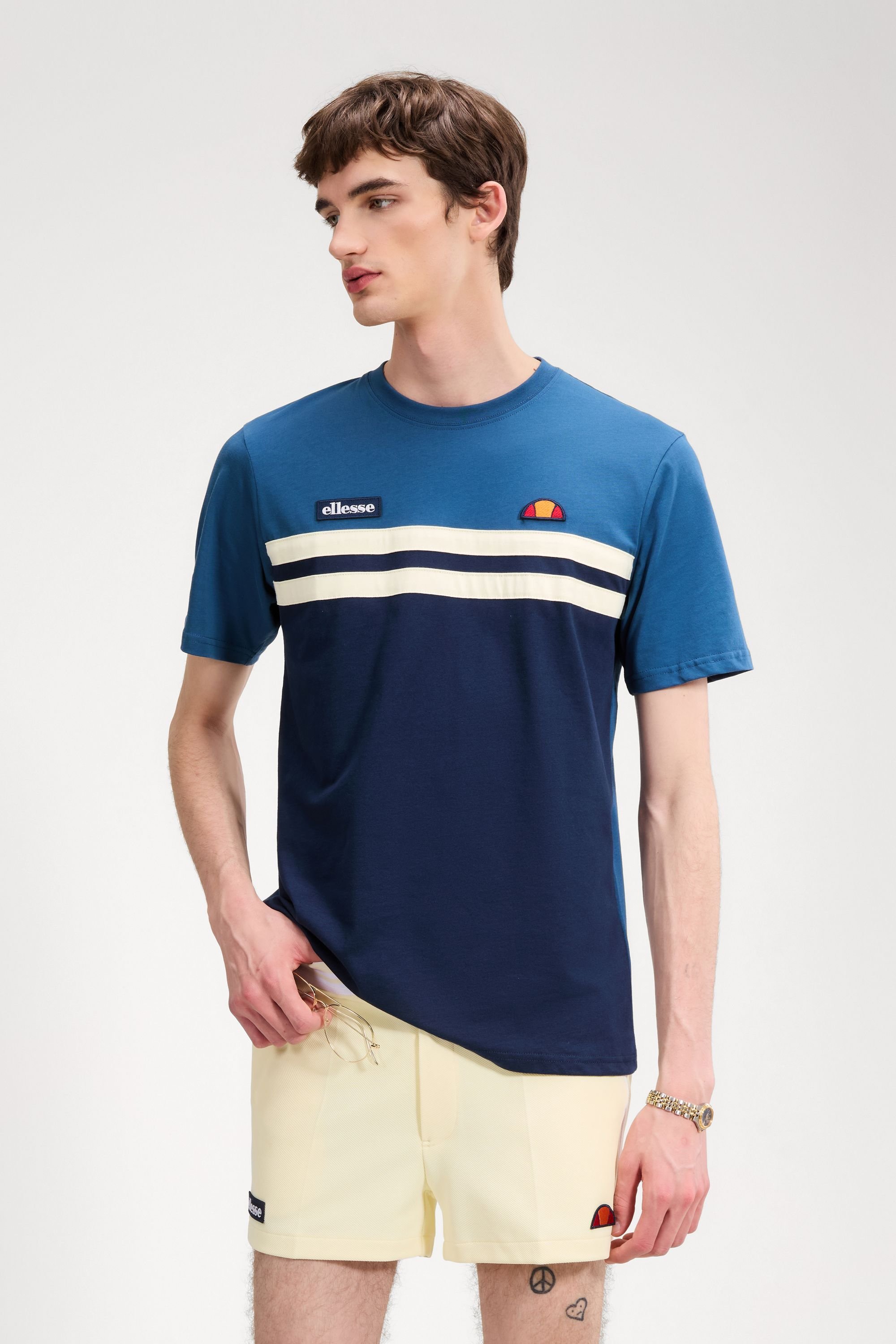 Stylish Navy Venire Tee by Ellesse crafted from 100% cotton single jersey. Features a colour-blocked design with embroidered badges for a bold, timeless look. Ideal for casual wear.