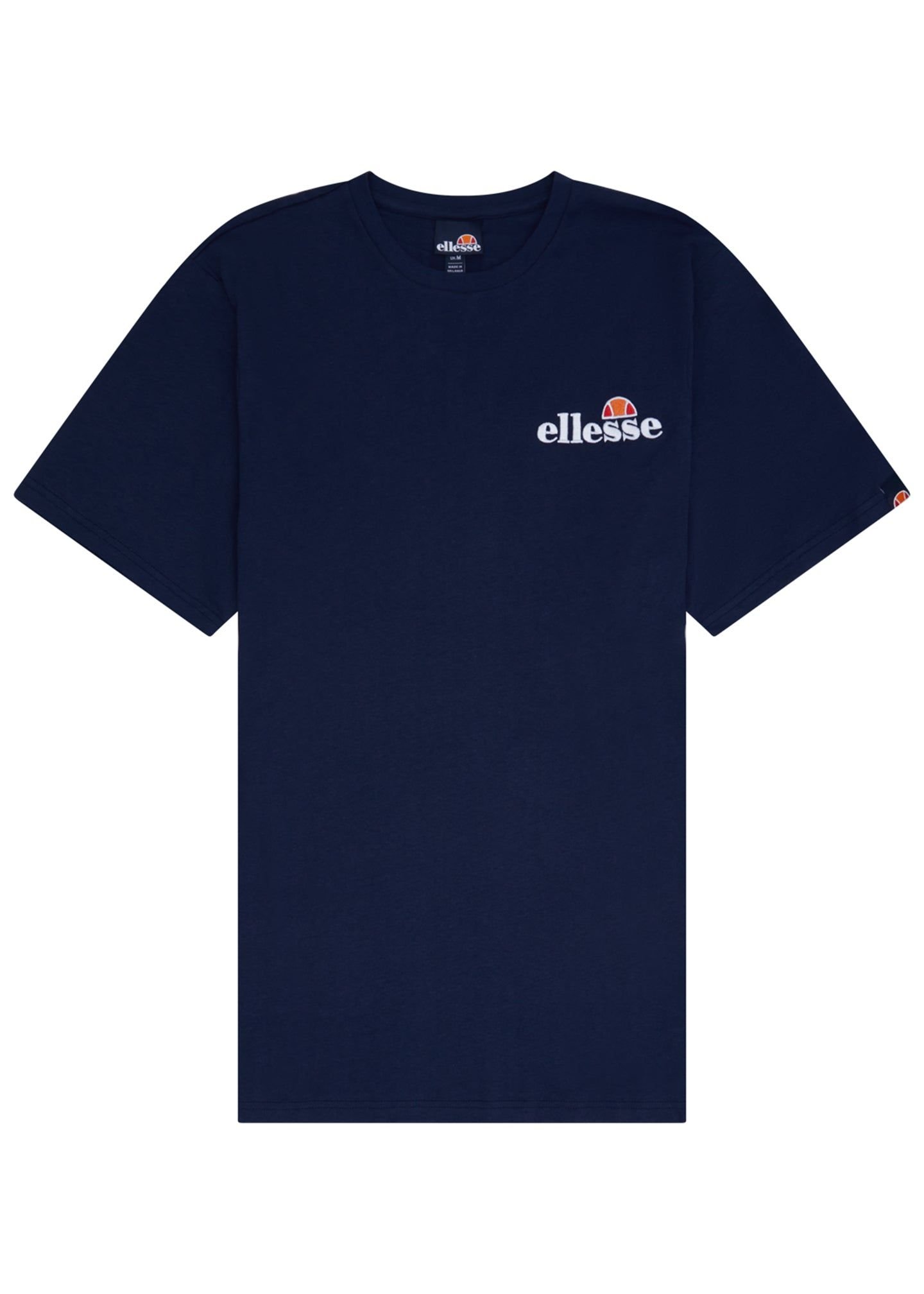 Classic navy blue cotton tee from Ellesse. Features a large white logo on the chest and a smaller orange logo on the sleeve. Perfect for casual wear with its soft fabric and clean design.
