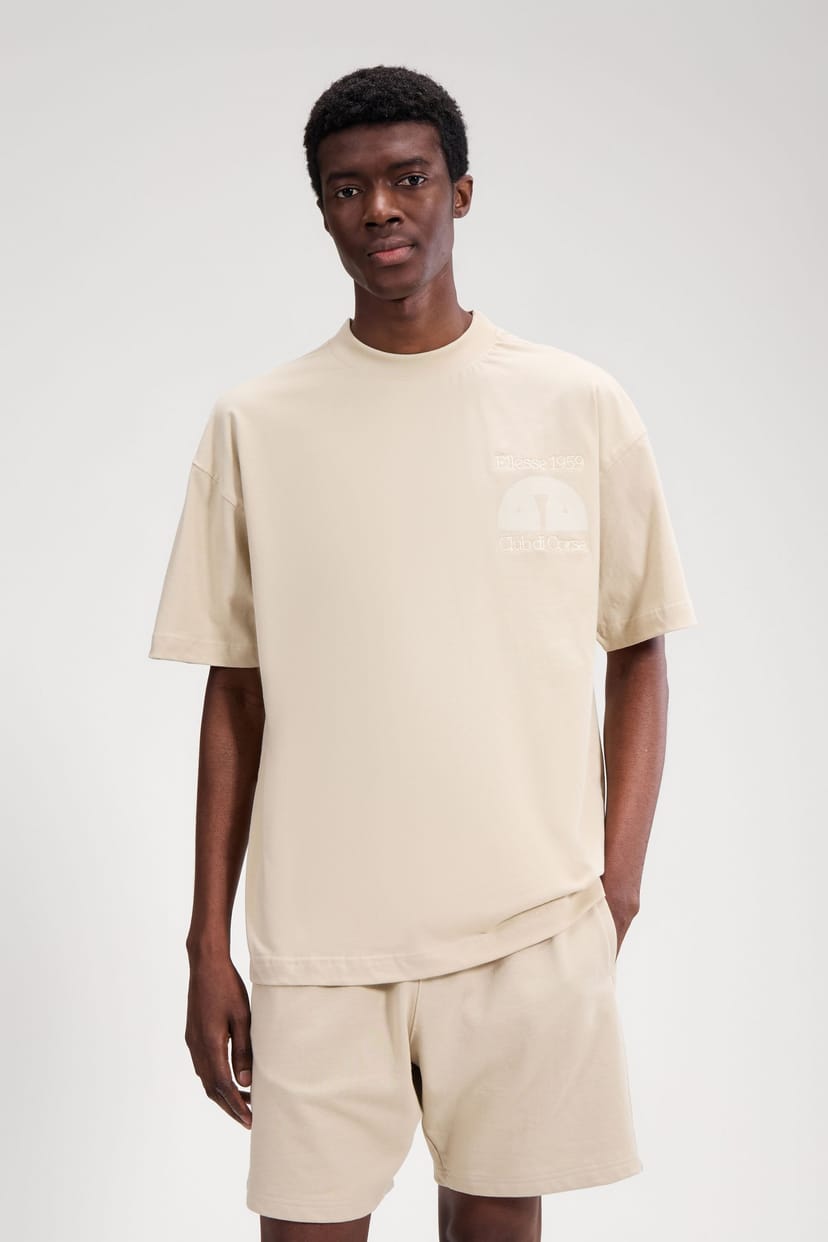 The Ellesse Men's Club Di Corsa Tee in Stone is available in sizes l, m, s, xl.