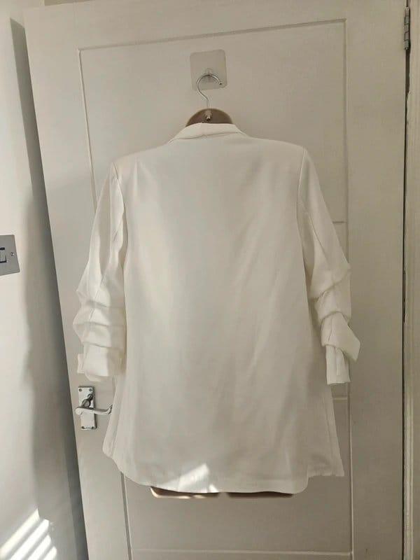 The Elsa White Silk-Blend Ruffled Sleeve Blazer is ideal for spring, summer, daytime, evening.