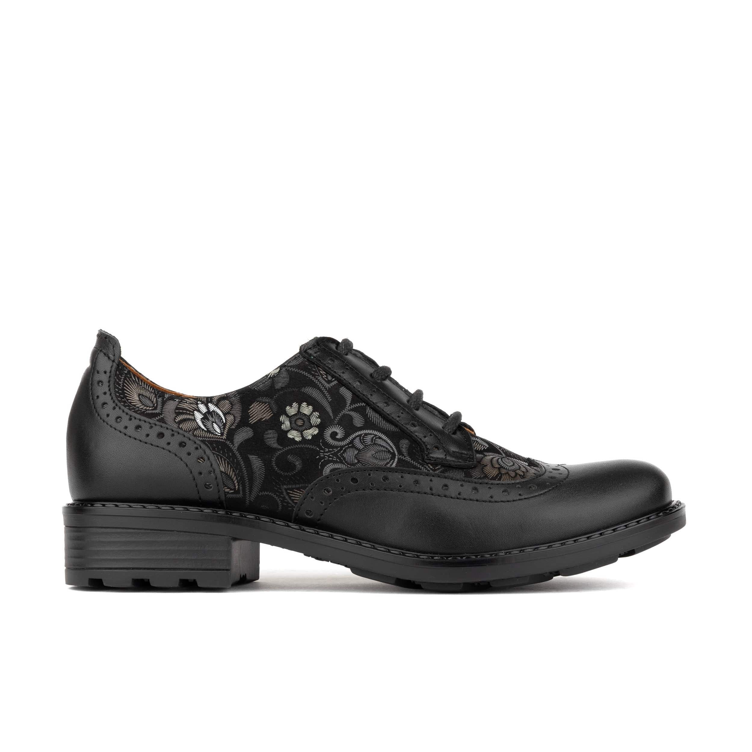 Stylish black leather derby shoe with an embossed floral design and a durable rubber sole. Ideal for adding a touch of elegance to any outfit.