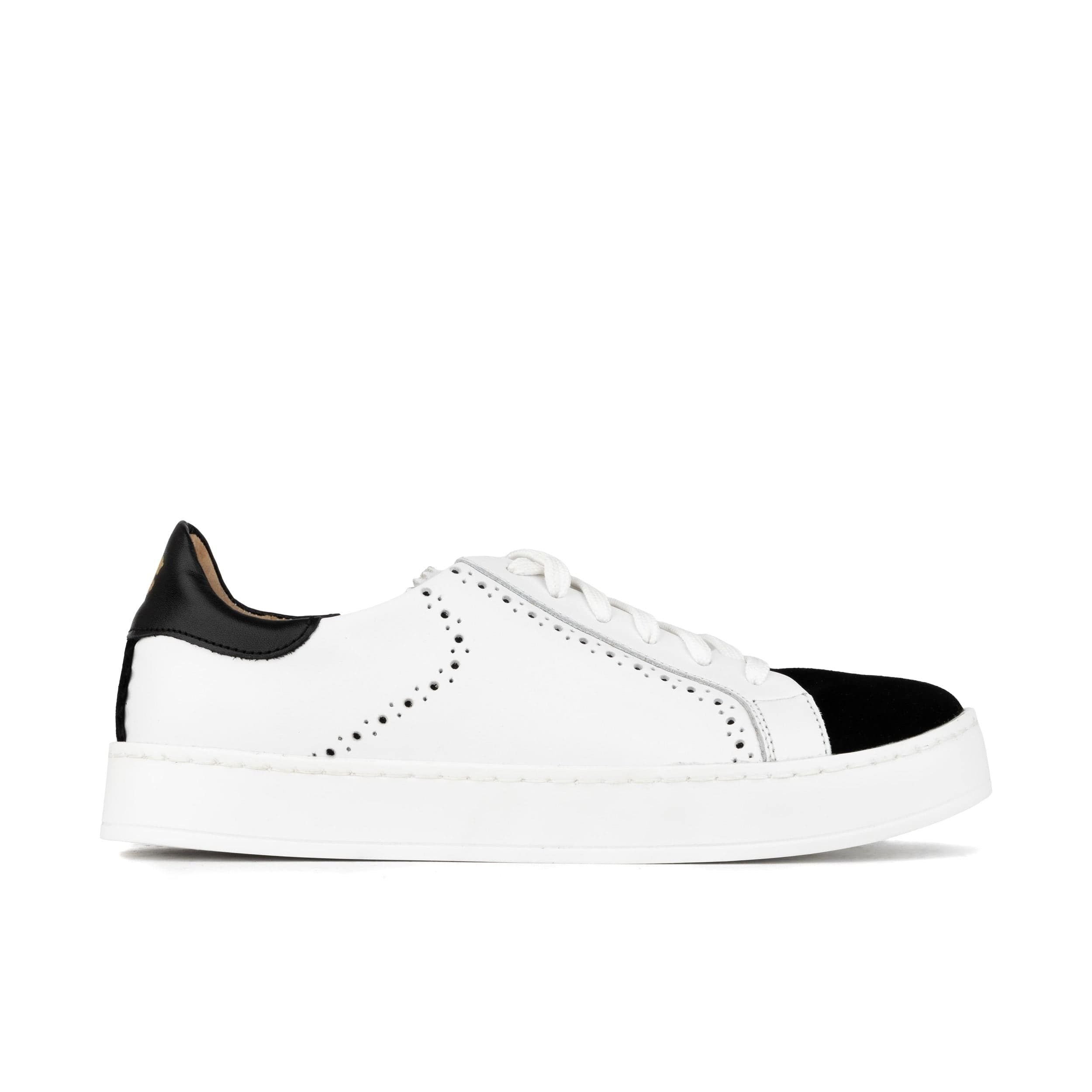 Stylish Embassy London Serena trainers in black and white. Featuring a white leather upper with brogue detailing and a black leather patch on the side. Perfect for a casual yet chic look.