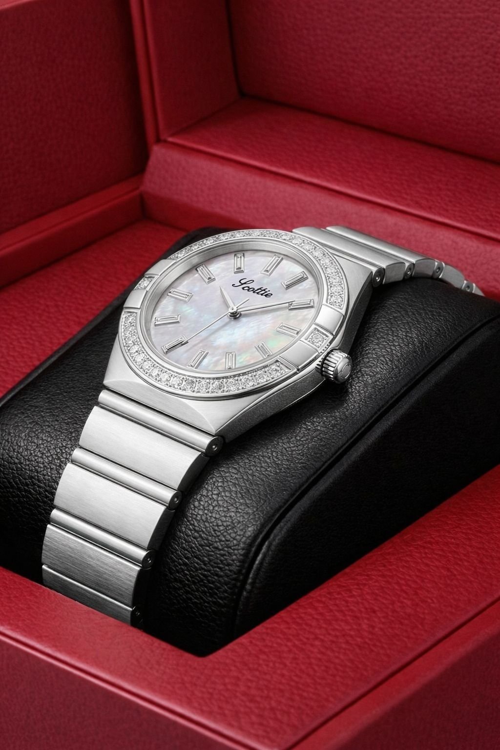 A refined silver ladies watch with a sparkling crystal-set bezel and a sleek silver sunray dial. Perfect for evenings, parties, and special occasions.