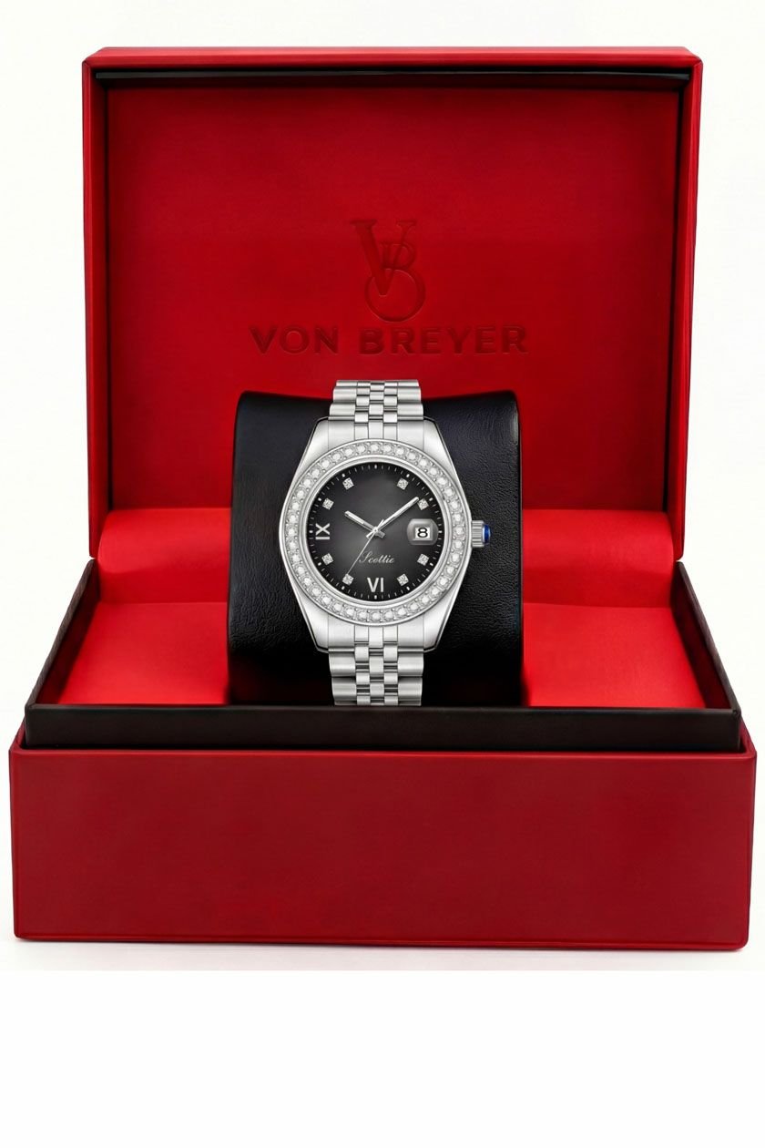 Luxurious silver watch with crystal detailing and diamond hour markers. Ideal for special occasions or as a gift.