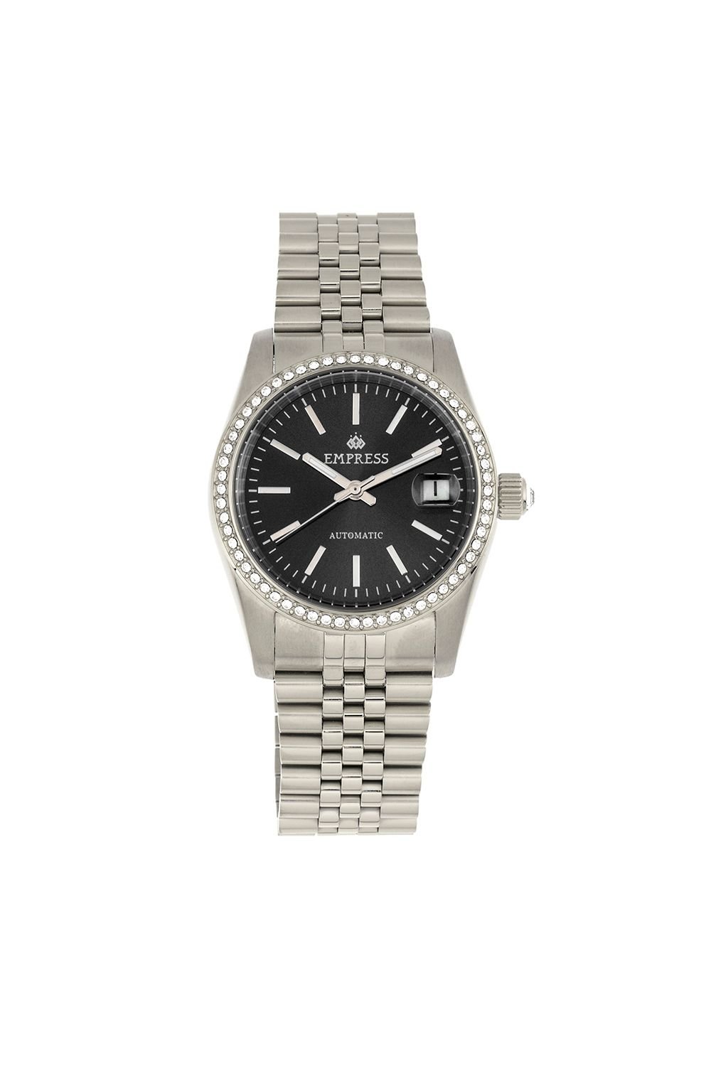 Stylish black automatic bracelet watch with a date display from Empress. Features a 316L surgical-quality stainless steel case, jeweled automatic movement, and a brushed-finish sunray dial. Perfect for adding a touch of elegance to any outfit.