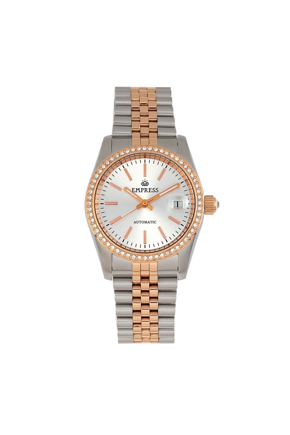 Stylish Empress watch with a rose gold bracelet and automatic movement. Features a jewel-encrusted bezel, brushed-finish dial, and date display. Perfect for adding a touch of elegance to any outfit.