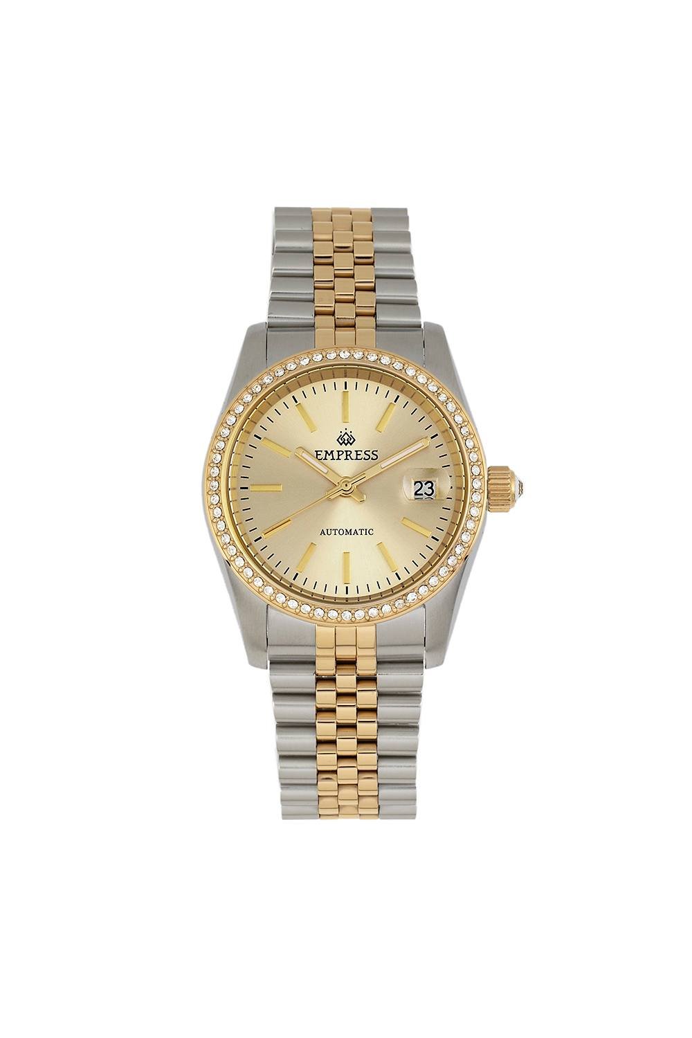 Elegant Empress watch with a silver and gold two-tone bracelet, jeweled automatic movement, and a brushed-finish sunray dial. Features a sapphire-coated mineral crystal and crystal surround bezel.