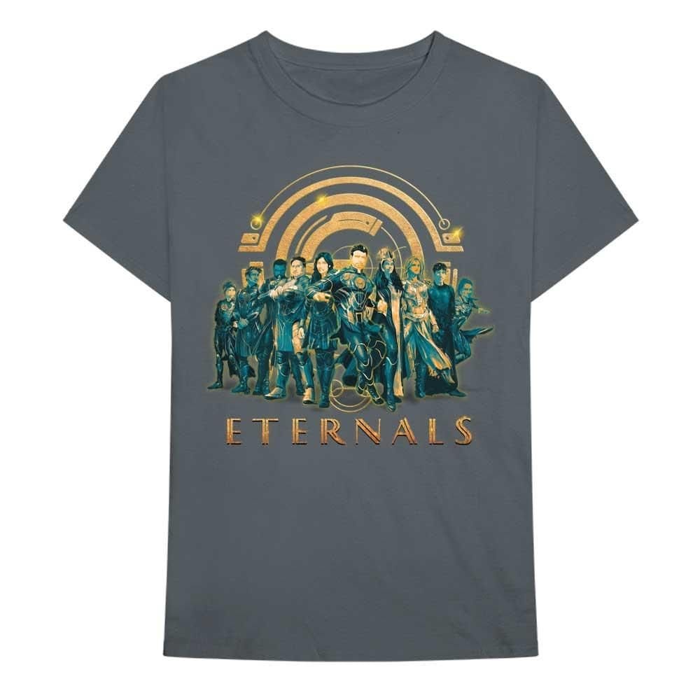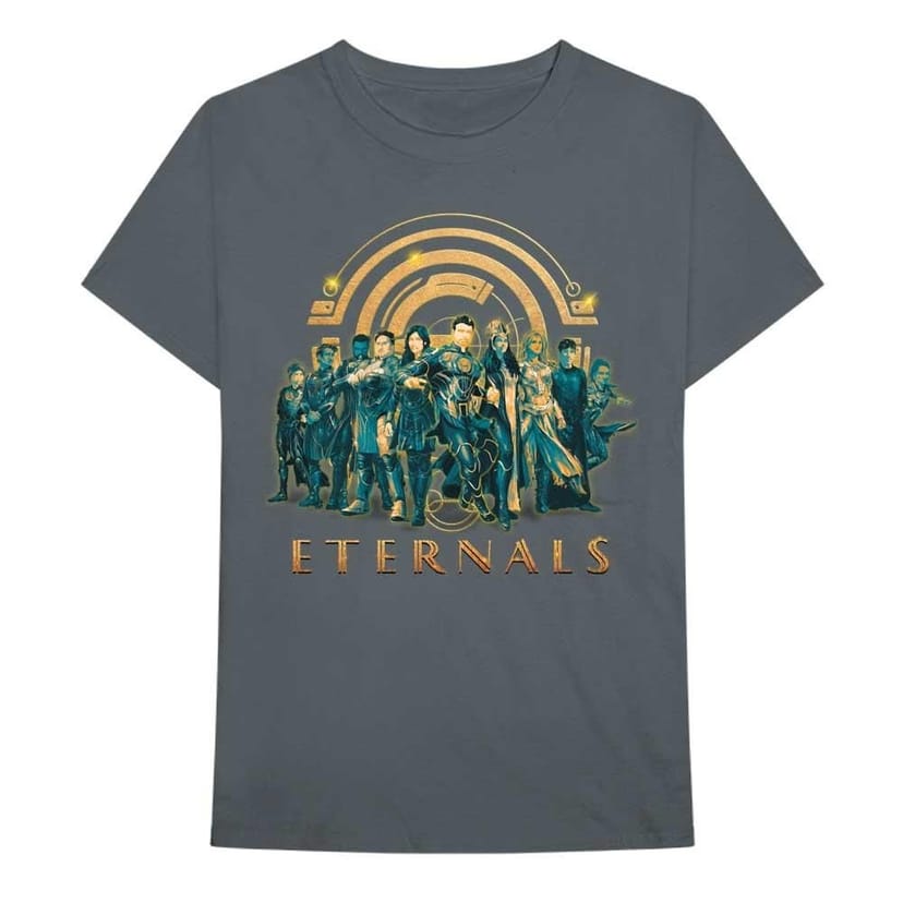 The The Eternals Men's Characters Cotton T-Shirt in Charcoal is available in sizes 2xl, l, m, s, xl.