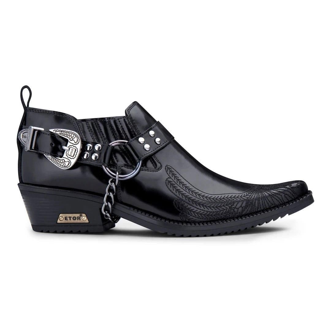 The Etor Men's Black Genuine Leather Western Cowboy Shoes is made from leather, metal.