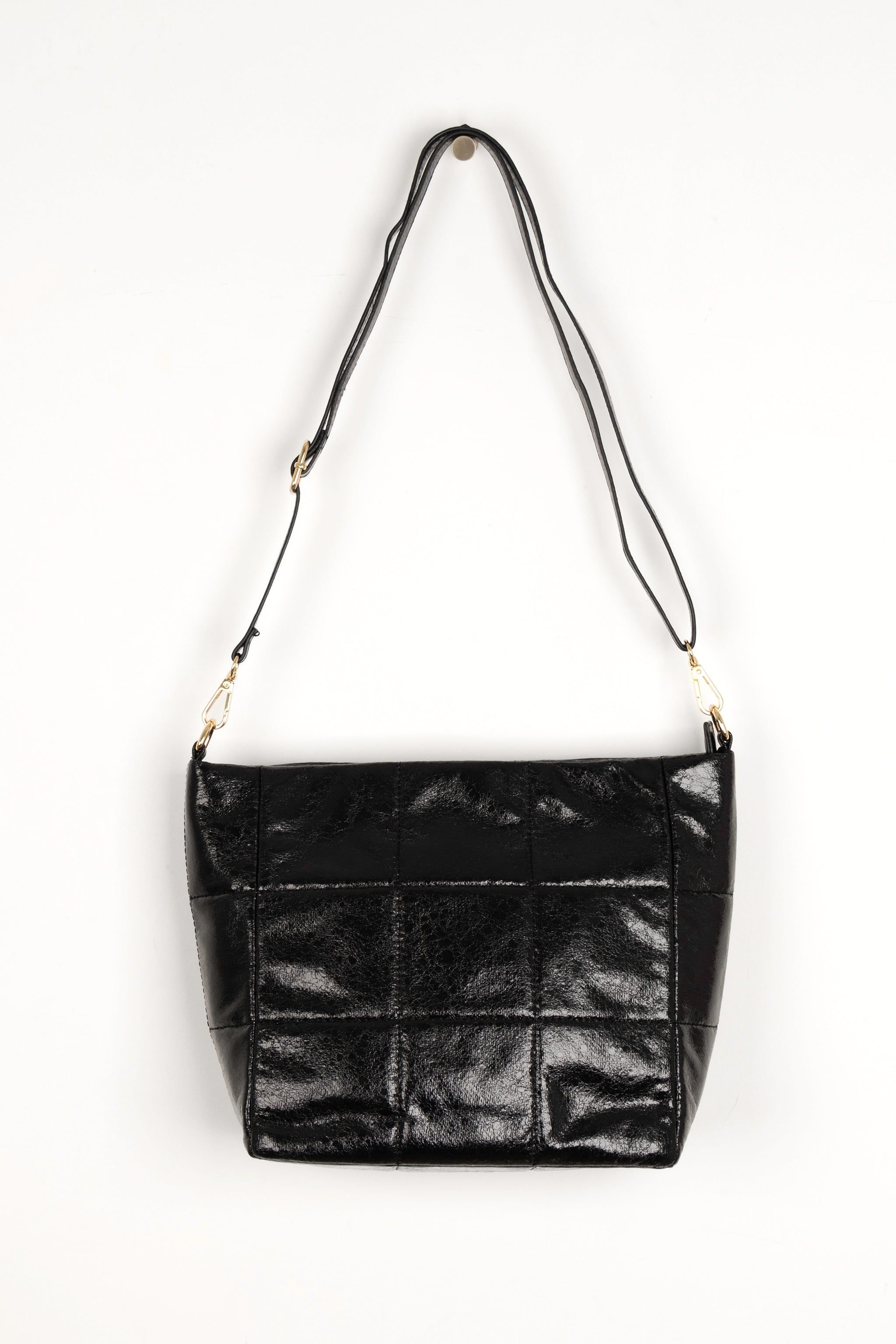 Stylish black metallic faux leather crossbody bag with a panelled design and adjustable, detachable strap. Features a zip closure and muted gold hardware. Perfect for everyday use.