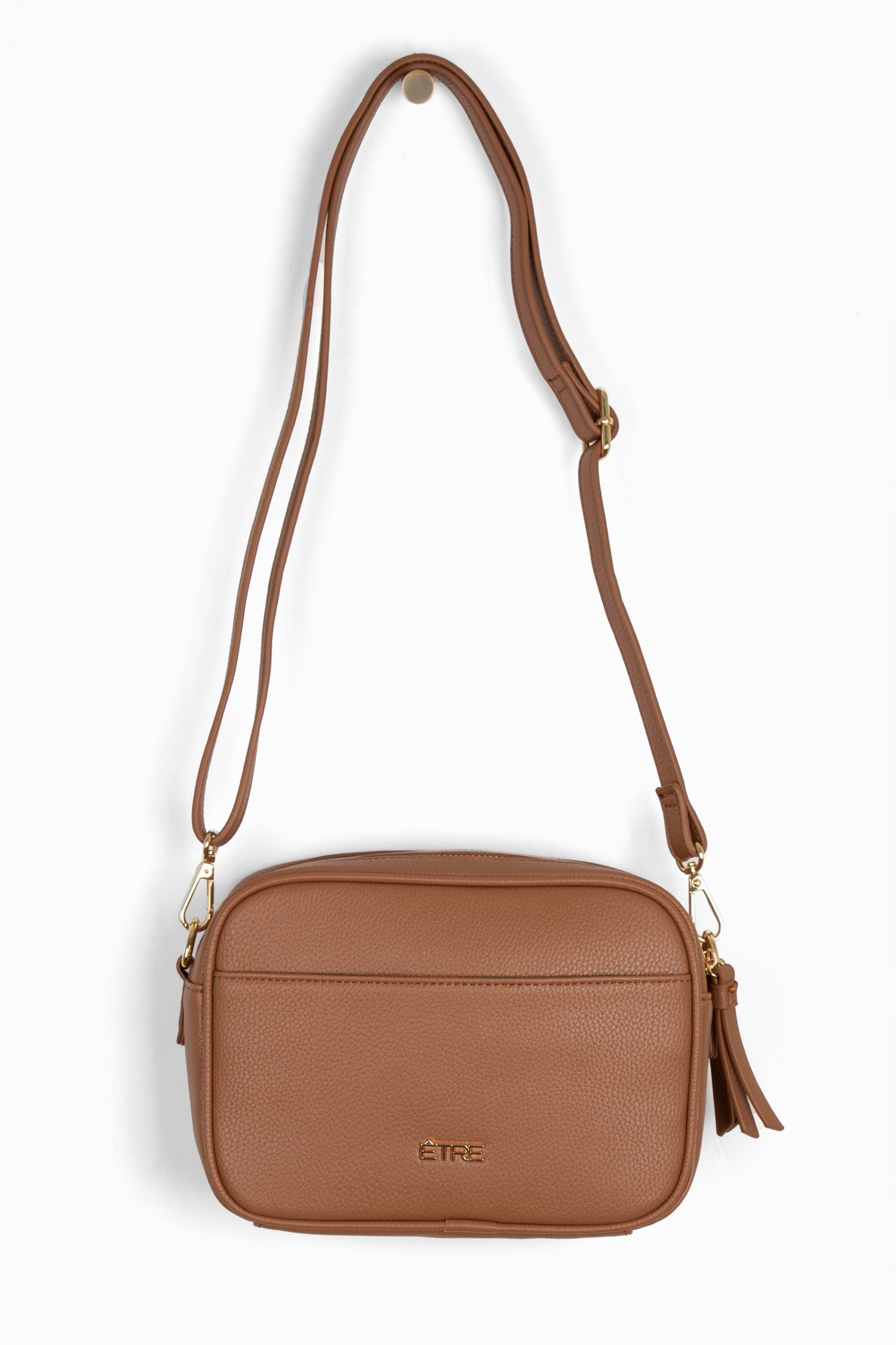 Stylish tan pebbled faux leather crossbody bag from Etre. Features an internal phone pocket and external zip closure. The bag includes a removable adjustable strap for versatile wear.