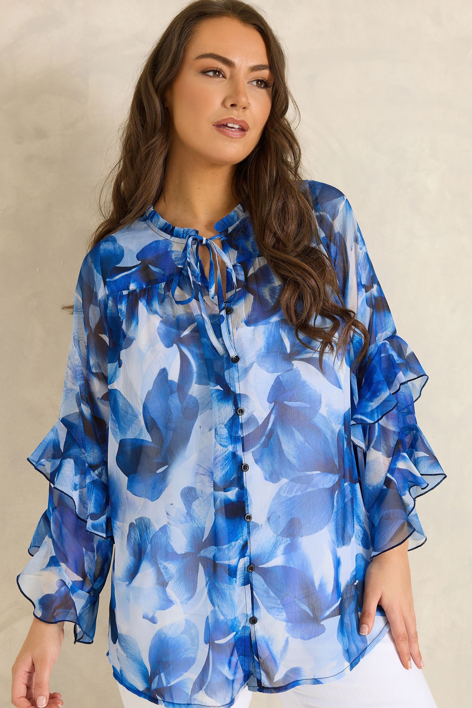 Elevate your everyday with this new-in Evans blouse. Crafted from a breathable woven fabric, this blouse was made with comfort in mind. It features a floral print, tie neckline with frill detailing, button fastenings and long frill sleeves, completed with a sheer overlay.