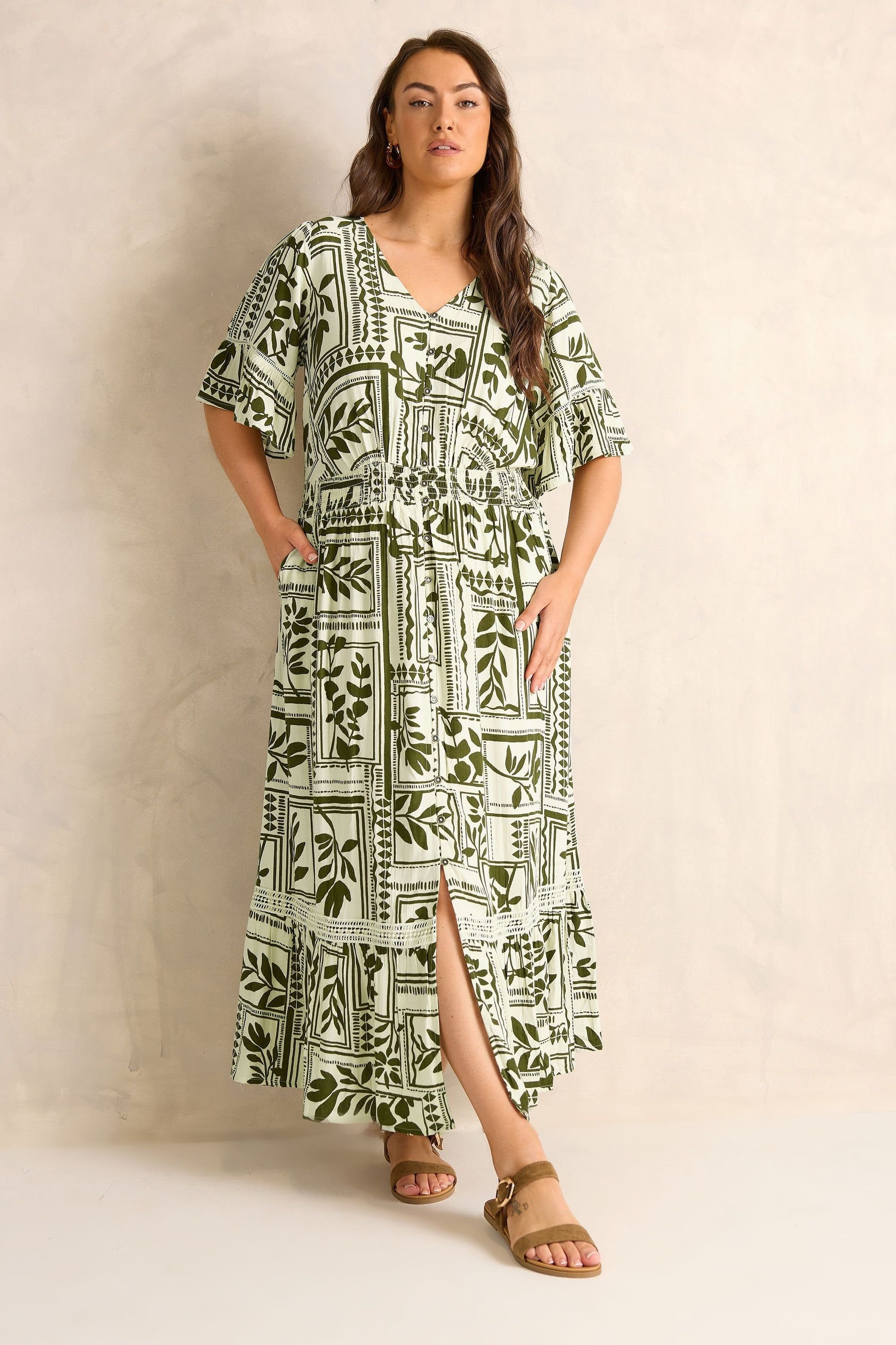 The Evans Green Leaf Print Button Through Maxi Dress is available in sizes 16, 18, 20, 22-24, 26-28, 30-32.