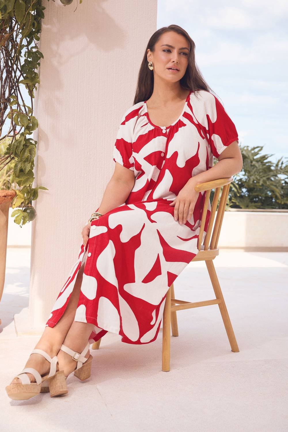Stylish maxi dress in a red and white abstract print crafted from a premium linen-blend fabric. Features a scoop neckline, short sleeves, and button fastenings. Ideal for a casual yet chic look.