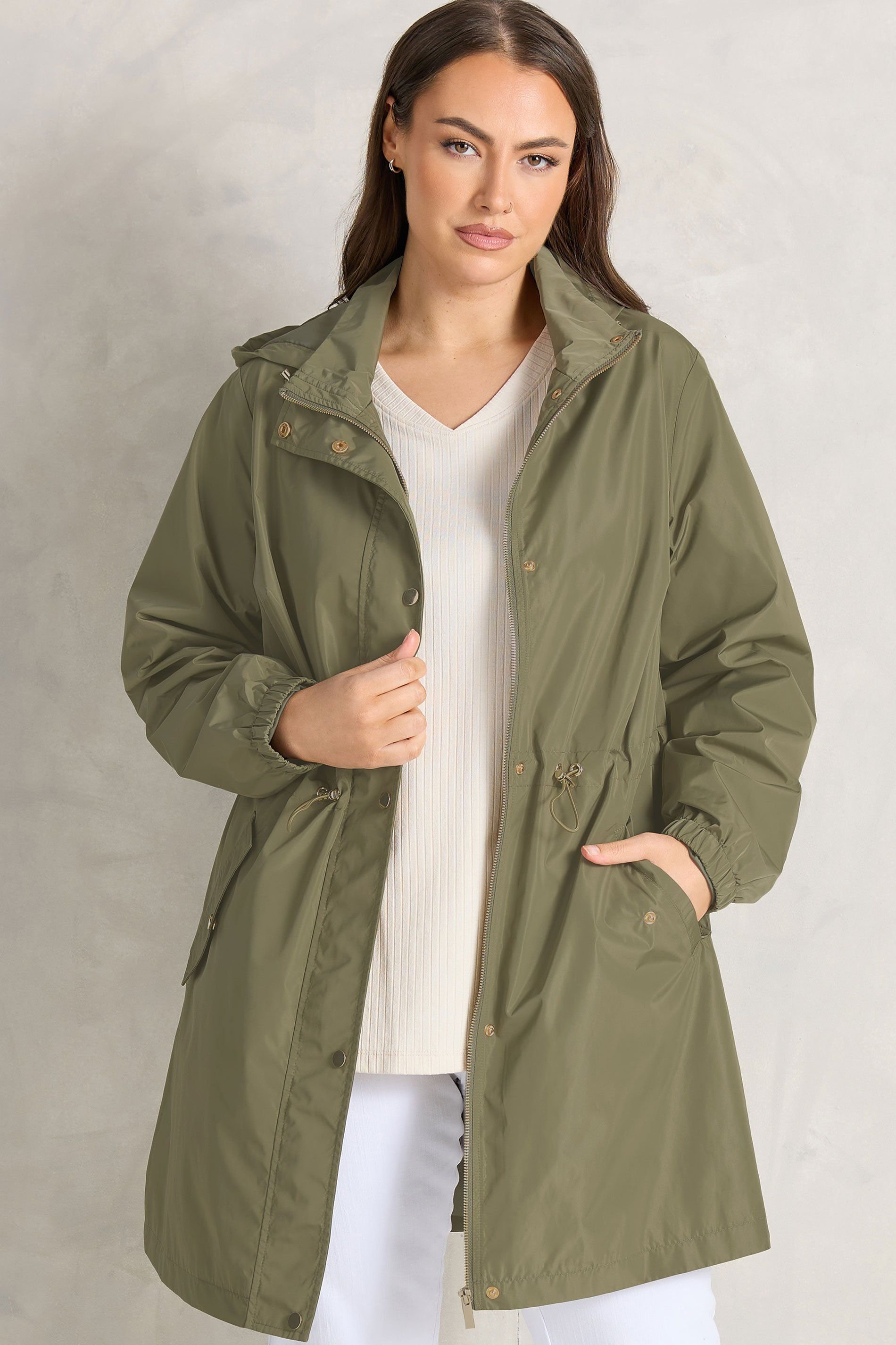 Stylish Evans rain jacket in olive with a hooded design. Made from lightweight woven fabric, it features zip and popper fastenings, a toggle drawstring waist, two functional pockets, and long cuffed sleeves. Perfect for rainy days.