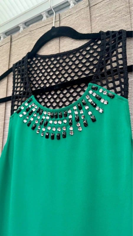 Stunning emerald green sleeveless top with statement embellished neckline. The lightweight flowy fabric and flattering relaxed fit make it perfect for any occasion.