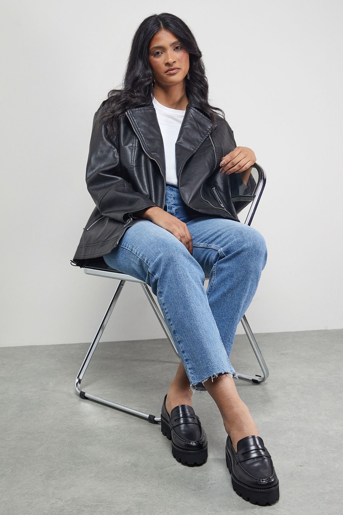 Stylish penny loafers in black genuine leather with classic stitching detail. Features a chunky creeper-style platform sole for added height and edge. Comfortable flat heel measuring between 0-2cm. Distinctive chunky tread pattern for grip and statement style. Traditional penny slot detailing across the vamp.