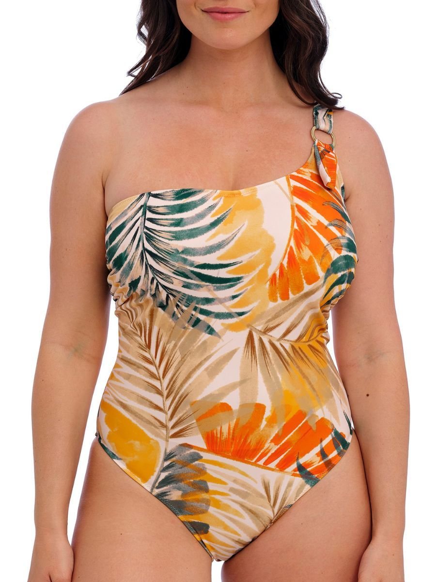 The Fantasie Orange Floral One-Piece Swimsuit is available in sizes 34D.