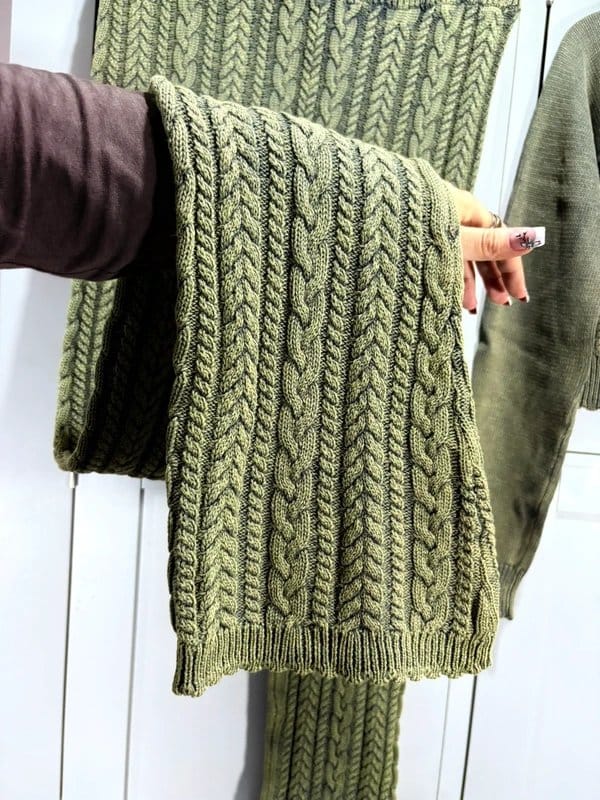 This khaki knitted set from Fashion Nova features a high-waisted flared trouser and a long-sleeve buttoned jacket. Made from thick stretch cable knit, it offers a stunning washed khaki colour perfect for a cozy yet stylish look.