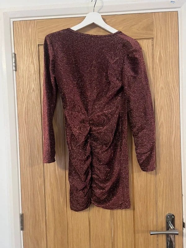 The Fashionkilla Burgundy Sequin Mini Dress is available in sizes M.