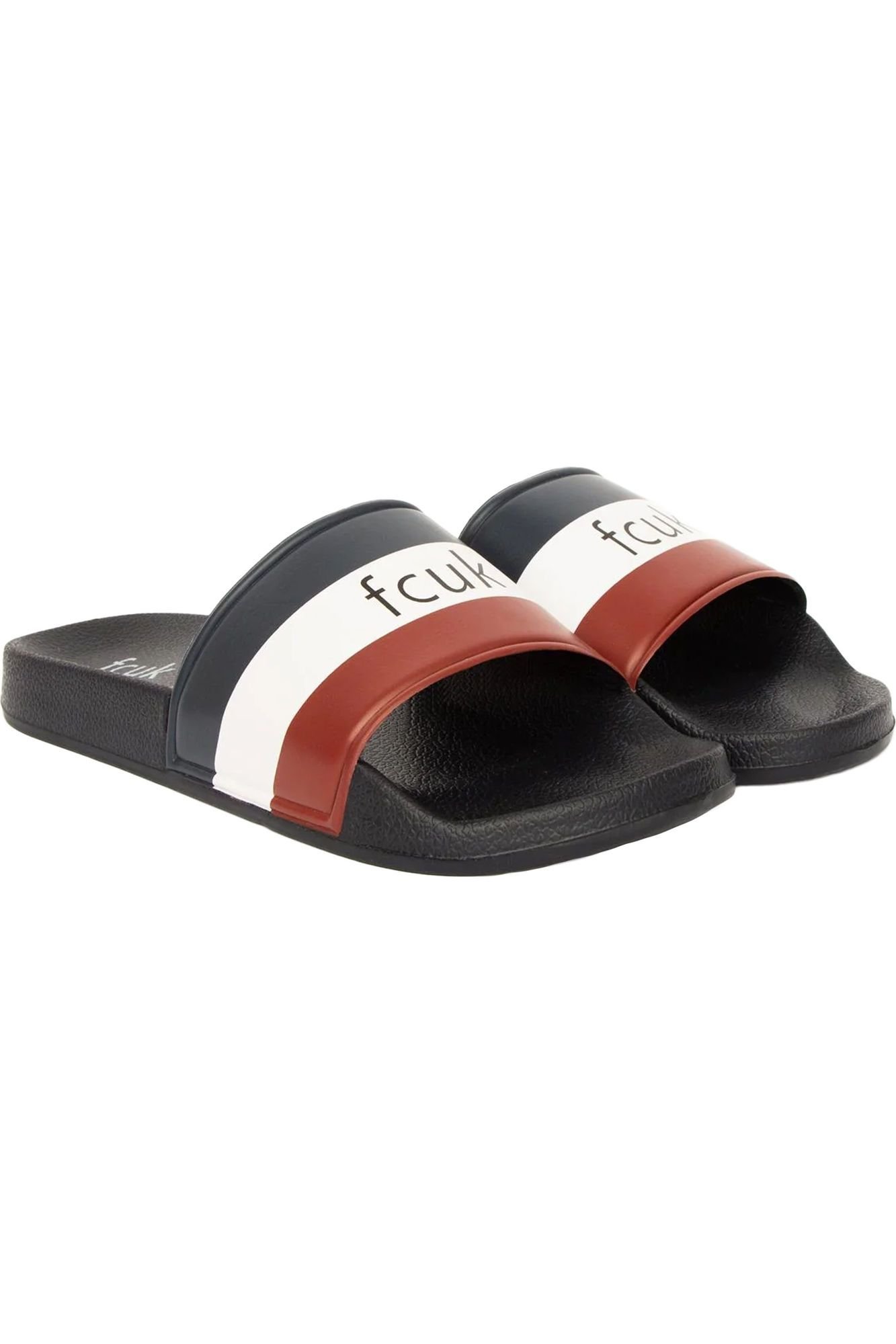 Stylish light blue stripe sliders by Fcuk. Made from durable PU and rubber, these slip-on sandals feature a sleek design with a logo stripe. Ideal for casual wear.