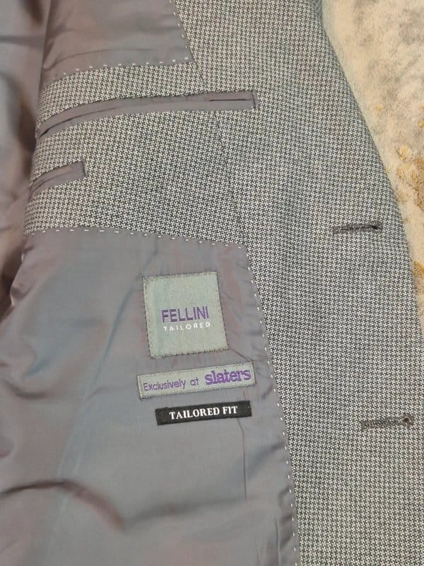 Elegant 3-piece suit set by Fellini in grey with a textured fabric. Features a jacket, trousers, and vest for a polished look. Perfect for formal occasions.