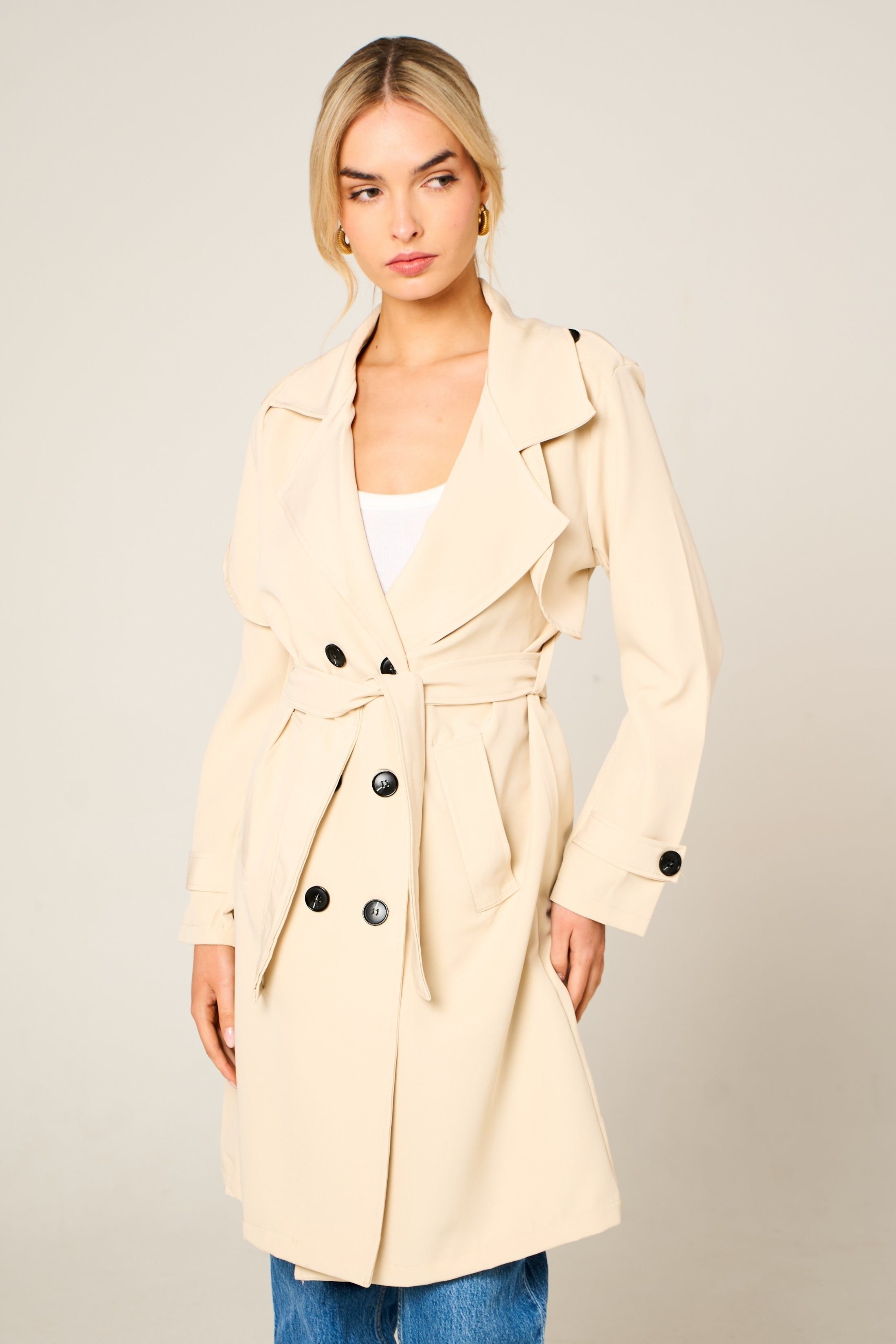 The Femme Luxe Beige Double Breasted Trench Coat is ideal for casual, everyday, work.