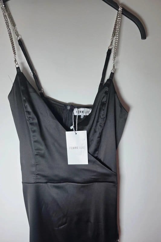 Brand new black satin mini dress with diamante tassel detail and diamante straps by Femme Luxe at Asos. Perfect for a sleek and elegant look.