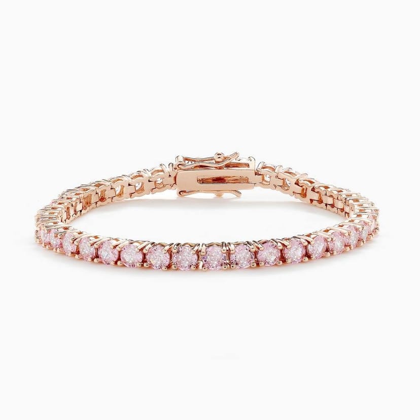 This rose gold tennis bracelet from FIFTH NYC JEWELLERY features a row of pink cubic zirconia stones set in a classic tennis bracelet style. Made from 925 sterling silver, it's a sparkling and elegant piece perfect for everyday wear.