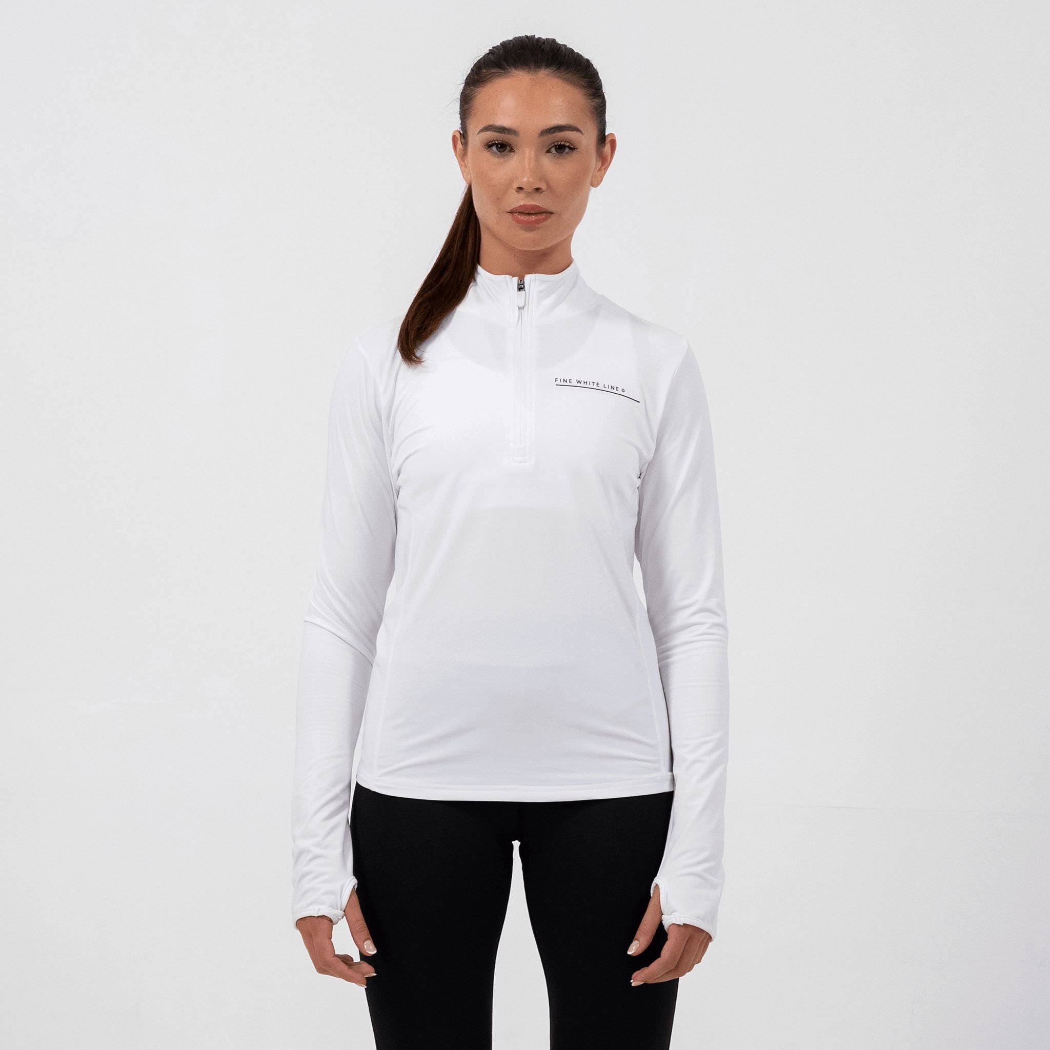Sleek long-sleeve 1/4 zip jacket in white from Fine White Line. Crafted with a peached finish and moisture-management fabric, it's ideal for active wear and layering.
