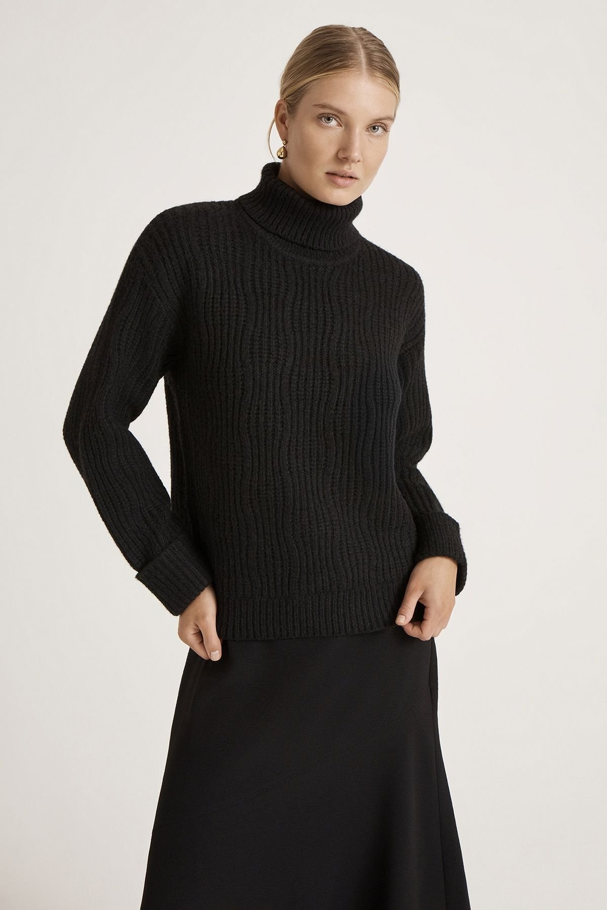 The Finery London Black Roll Neck Knitted Jumper is made from knitted yarn.