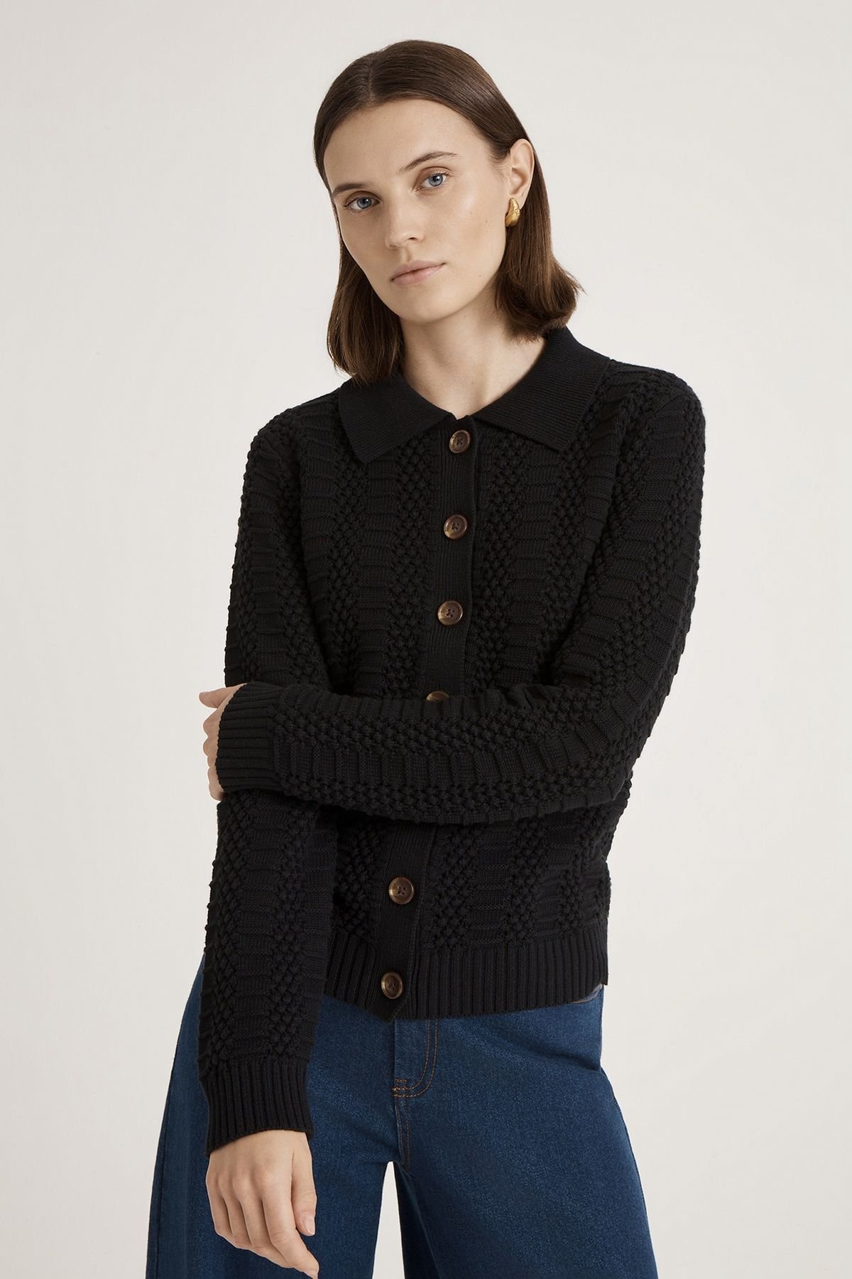 The Finery London Black Cotton Knitted Collared Cardigan is available in sizes 10, 12, 14, 16.