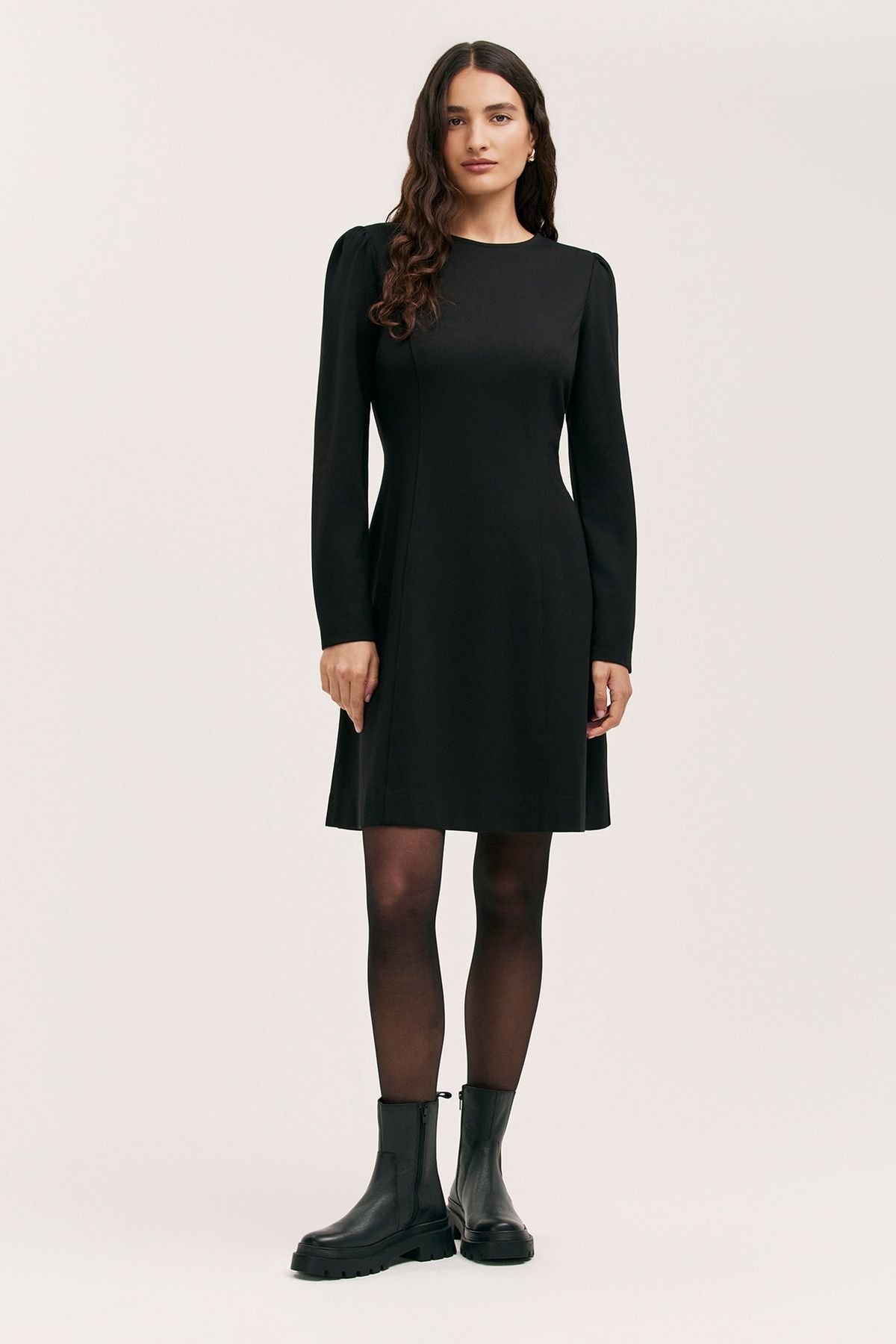 Sleek black ponte jersey dress with a round neckline and long sleeves. The A-line silhouette ensures a flattering fit. Ideal for effortless elegance.