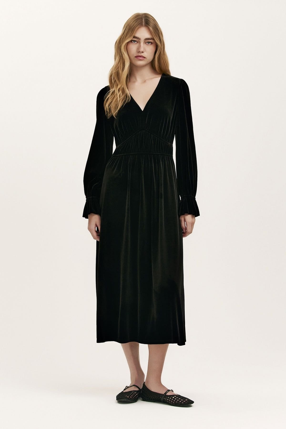 Back to Finery London Black Velvet V-Neck Midi Dress →
