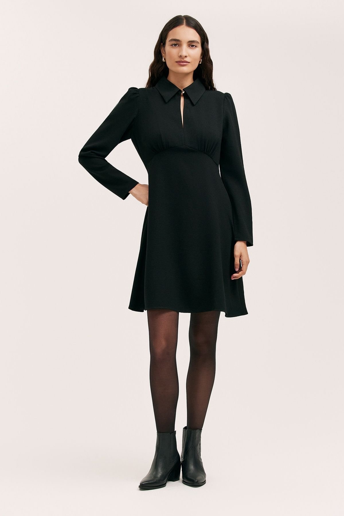 Stylish black crepe dress with a collared neckline and long sleeves. Features a keyhole detail at the front and a flared skirt. Ideal for both casual and formal occasions.