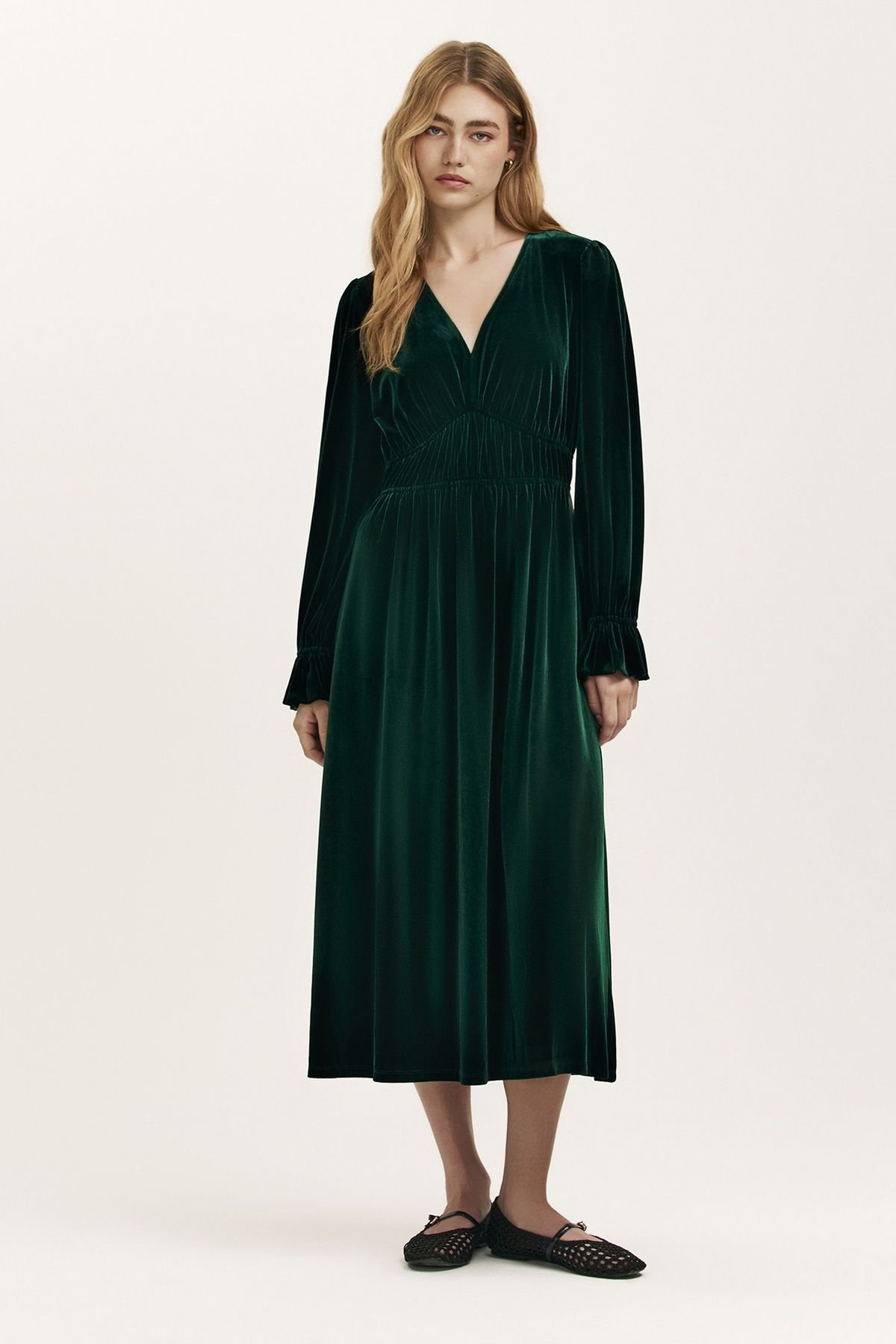 The Finery London Bottle Green Velvet Midi Dress is made from velvet.