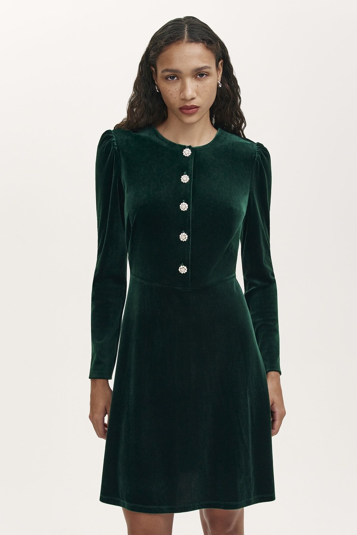 Luxuriously soft velvet knee-length dress in a flattering A-line fit. Features a round neckline and full-length sleeves. Dazzling button detail makes it an eye-catching addition to your wardrobe, perfect for party season.