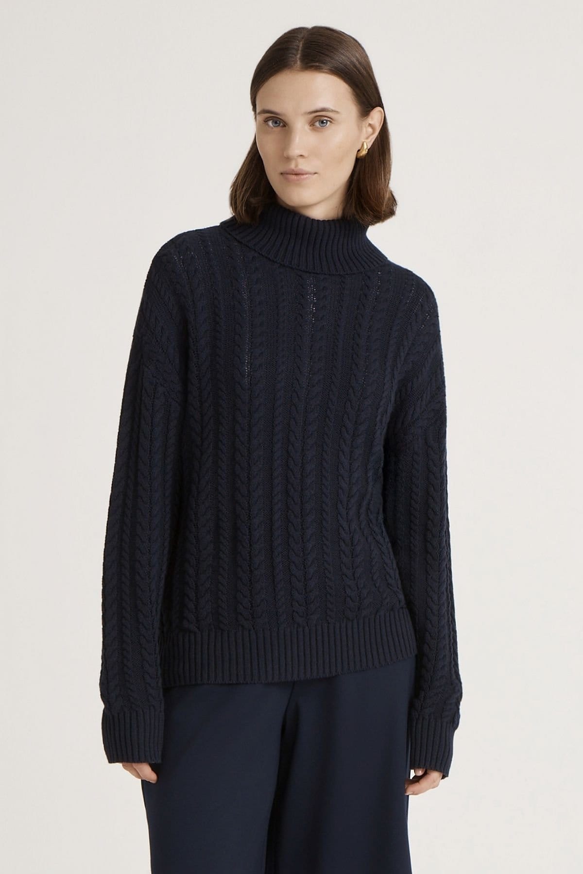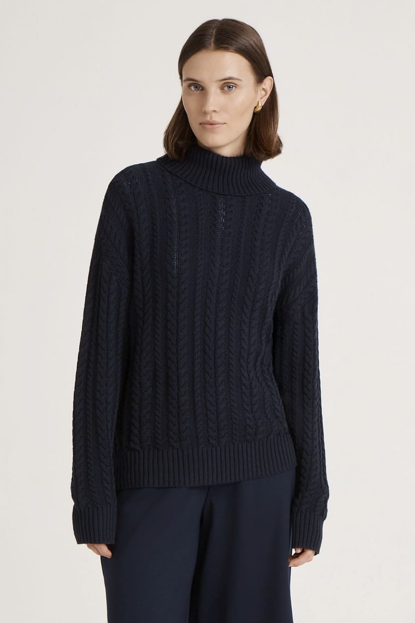 The Finery London Dark Navy Turtle Neck Knitted Sweater is made from cotton.