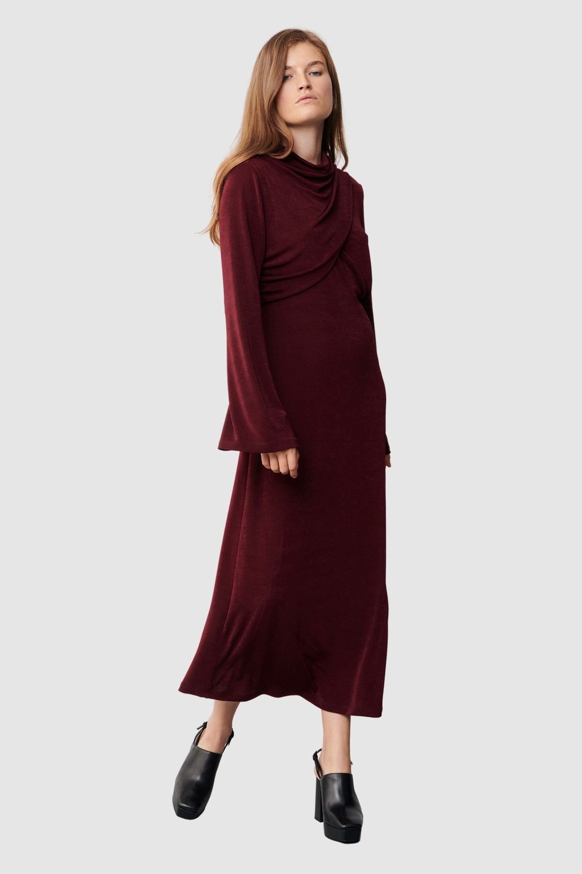 Sophisticated midi dress in maroon Buzy fabric featuring a cowl neckline and long flute-like sleeves. Ideal for evening events or date nights.