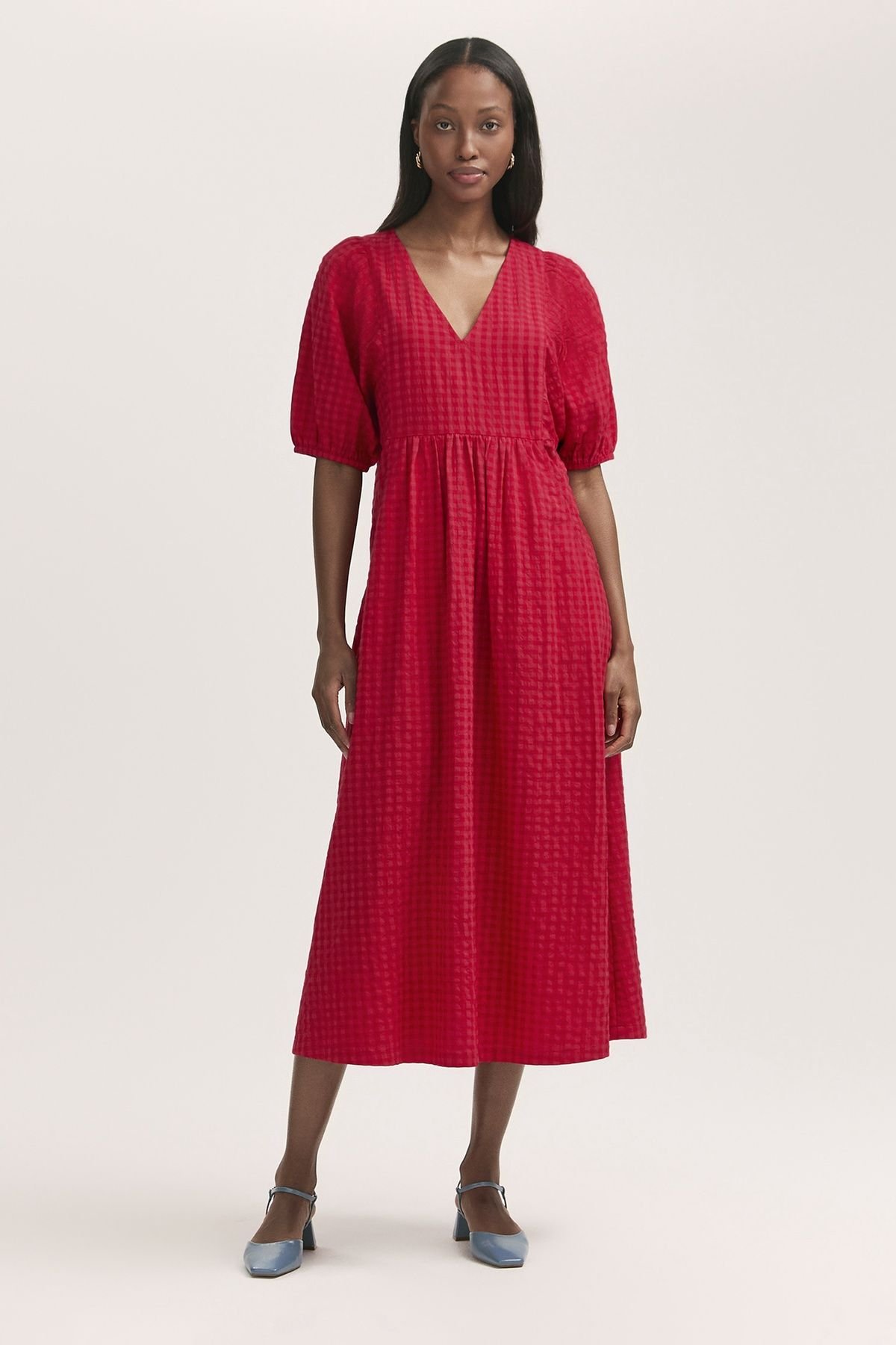 This red gingham seersucker midi dress features a relaxed and oversized fit. With short puff sleeves, a V-neckline, and a waist seam, it's a stylish and comfortable choice for any occasion.