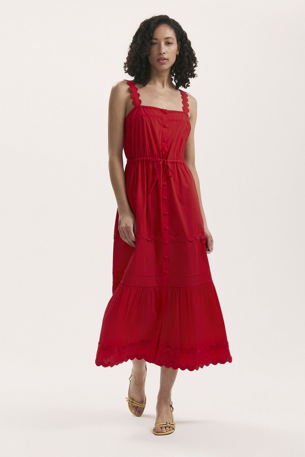 The Finery London Red Cotton Midi Dress with Ric Rac Detail is ideal for casual, beach, summer events.
