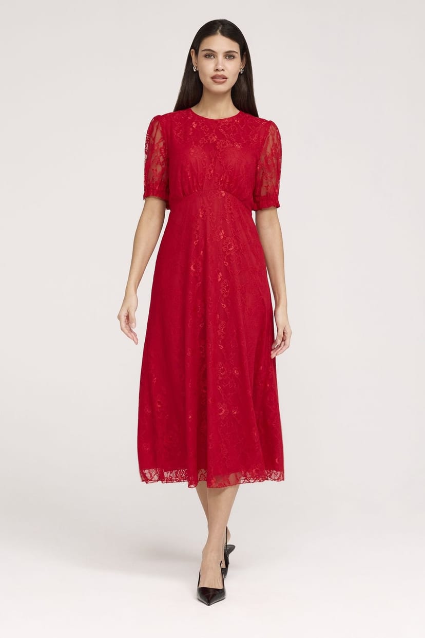 The Finery London Red Lace Midi Dress is ideal for evening, date-night, party.